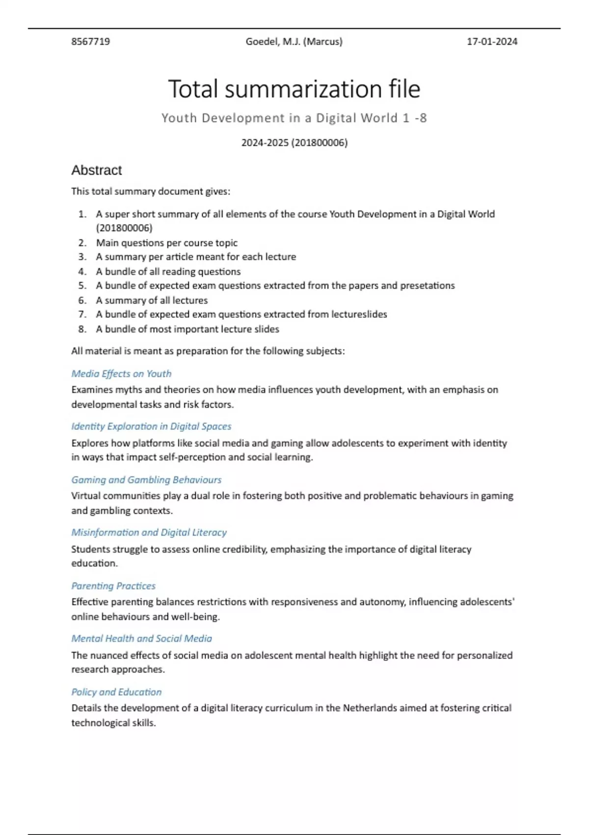 This total summary document gives: 1. A super short summary of all elements of the course Youth Development in a Digital World () 2. Main questions per course topic 3. A summary per article meant for each lecture 4. A bundle of all reading questions 5. A bundle of expected exam questions extracted from the papers and presetations 6. A summary of all lectures 7. A bundle of expected exam questions extracted from lectureslides 8. A bundle of most important lecture slides All material is meant as preparation for the exam on