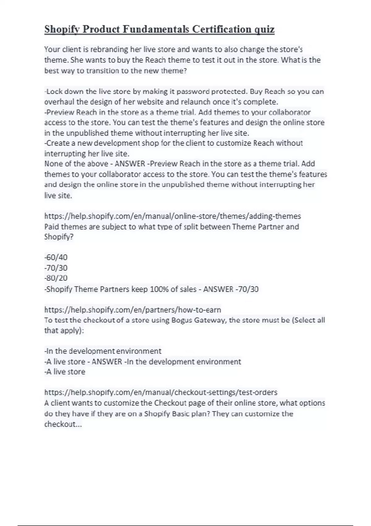 Your client is rebranding her live store and wants to also change the store's theme. She wants to buy the Reach theme to test it out in the store. What is the best way to transition to the new theme? -Lock down the live store by making it password protected. Buy Reach so you can overhaul the design of her website and relaunch once it's complete. -Preview Reach in the store as a theme trial. Add themes to your collaborator access to the store. You can test the theme's features and design the online store in the unpublished theme without interrupting her live site. -Create a new development shop for the client to customize Reach without interrupting her live site. None of the above - ANSWER -Preview Reach in the store as a theme trial. Add themes to your collaborator access to the store. You can test the theme's features and design the online store in the unpublished theme without interrupting her live site. Paid themes are subject to what type of split between Theme Partner and Shopify? -60/40 -70/30 -80/20 -Shopify Theme Partners keep 100% of sales - ANSWER -70/30 To test the checkout of a store using Bogus Gateway, the store must be (Select all that apply): -In the development environment -A live store - ANSWER -In the development environment -A live store A client wants to customize the Checkout page of their online store, what options do they have if they are on a Shopify Basic plan? They can customize the checkout...