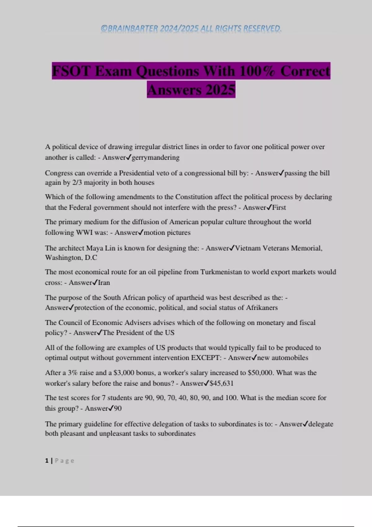 FSOT Exam Questions With 100% Correct Answers 2025 A political device of drawing irregular district lines in order to favor one political power over another is called: - Answergerrymandering Congress can override a Presidential veto of a congressional bill by: - Answerpassing the bill again by 2/3 majority in both houses Which of the following amendments to the Constitution affect the political process by declaring that the Federal government should not interfere with the press? - AnswerFirst The primary medium for the diffusion of American popular culture throughout the world following WWI was: - Answermotion pictures The architect Maya Lin is known for designing the: - AnswerVietnam Veterans Memorial, Washington, D.C The most economical route for an oil pipeline from Turkmenistan to world export markets would cross: - AnswerIran The purpose of the South African policy of apartheid was best described as the: - Answerprotection of the economic, political, and social status of Afrikaners The Council of Economic Advisers advises which of the following on monetary and fiscal policy? - AnswerThe President of the US All of the following are examples of US products that would typically fail to be produced to optimal output without government intervention EXCEPT: - Answernew automobiles After a 3% raise and a $3,000 bonus, a worker's salary increased to $50,000. What was the worker's salary before the raise and bonus? - Answer$45,631 The test scores for 7 students are 90, 90, 70, 40, 80, 90, and 100. What is the median score for this group? - Answer90 The primary guideline for effective del