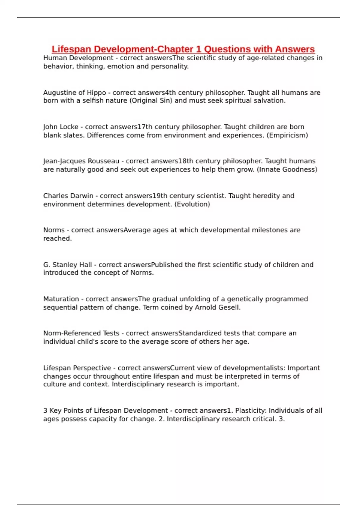 Lifespan Development-Chapter 1 Questions with Answers Human Development - correct answersThe scientific study of age-related changes in behavior, thinking, emotion and personality. Augustine of Hippo - correct answers4th century philosopher. Taught all humans are born with a selfish nature (Original Sin) and must seek spiritual salvation. John Locke - correct answers17th century philosopher. Taught children are born blank slates. Differences come from environment and experiences. (Empiricism) Jean-Jacques Rousseau - correct answers18th century philosopher. Taught humans are naturally good and seek out experiences to help them grow. (Innate Goodness) Charles Darwin - correct answers19th century scientist. Taught heredity and environment determines development. (Evolution) Norms - correct answersAverage ages at which developmental milestones are reached. G. Stanley Hall - correct answersPublished the first scientific study of children and introduced the concept of Norms. Maturation - correct answersThe gradual unfolding of a genetically programmed sequential pattern of change. Term coined by Arnold Gesell. Norm-Referenced Tests - correct answersStandardized tests that compare an individual child's score to the average score of others her age. Lifespan Perspective - correct answersCurrent view of developmentalists: Important changes occur throughout entire lifespan and must be interpreted in terms of culture and context. Interdisciplinary research is important. 3 Key Points of Lifespan Development - correct answers1. Plasticity: Individuals of all ages possess capacity for change. 2. Interdisciplinary research critical. 3. Multicontextual Nature of Development: Development occurs within several contexts (ie family, neighborhood, culture) Physical Domain - correct answersChanges in size, shape and characteristics of the body. Cognitive Domain - correct answersChanges in thinking, memory, problem solving, and other intellectual skills. Social Domain - correct answersChange in variables that are associated with the relationship of an individual to others.