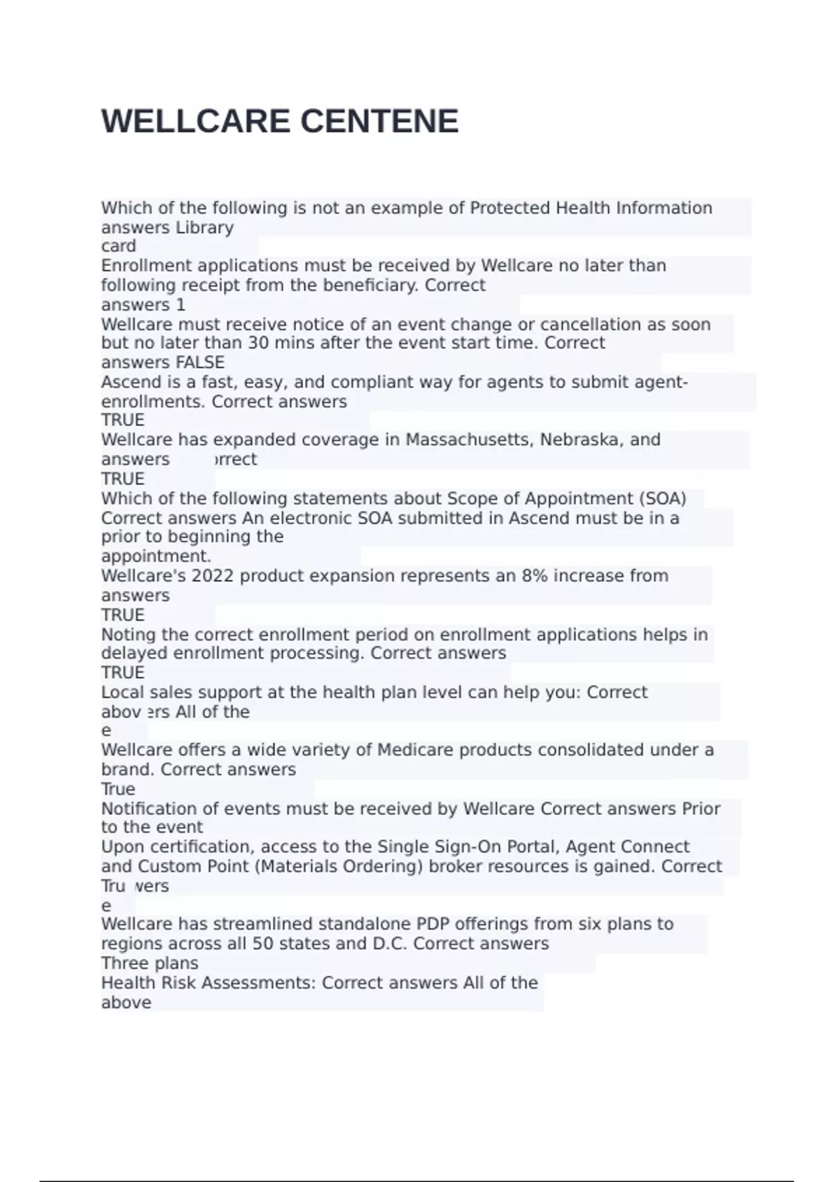 Which of the following is not an example of Protected Health Information (PHI)? Correct answers Library card Enrollment applications must be received by Wellcare no later than ___ calendar day(s) following receipt from the beneficiary. Correct answers 1 Wellcare must receive notice of an event change or cancellation as soon as possible, but no later than 30 mins after the event start time. Correct answers FALSE Ascend is a fast, easy, and compliant way for agents to submit agent-assisted electronic enrollments. Correct answers TRUE Wellcare has expanded coverage in Massachusetts, Nebraska, and Oklahoma. Correct answers TRUE Which of the following statements about Scope of Appointment (SOA) is FALSE? Correct answers An electronic SOA submitted in Ascend must be in a Pending status prior to beginning the appointment. Wellcare's 2022 product expansion represents an 8% increase from 2021. Correct answers TRUE Noting the correct enrollment period on enrollment applications helps in preventing delayed enrollment processing. Correct answers TRUE Local sales support at the health plan level can help you: Correct answers All of the above Wellcare offers a wide variety of Medicare products consolidated under a new Wellcare brand. Correct answers True Notification of events must be received by Wellcare Correct answers Prior to the event Upon certification, access to the Single Sign-On Portal, Agent Connect (Broker Portal) and Custom Point (Materials Ordering) broker resources is gained. Correct answers True Wellcare has streamlined standalone PDP offerings from six plans to ___ in all 34 regions across all 50 states and D.C. Correct answers Three plans Health Risk Assessments: Correct