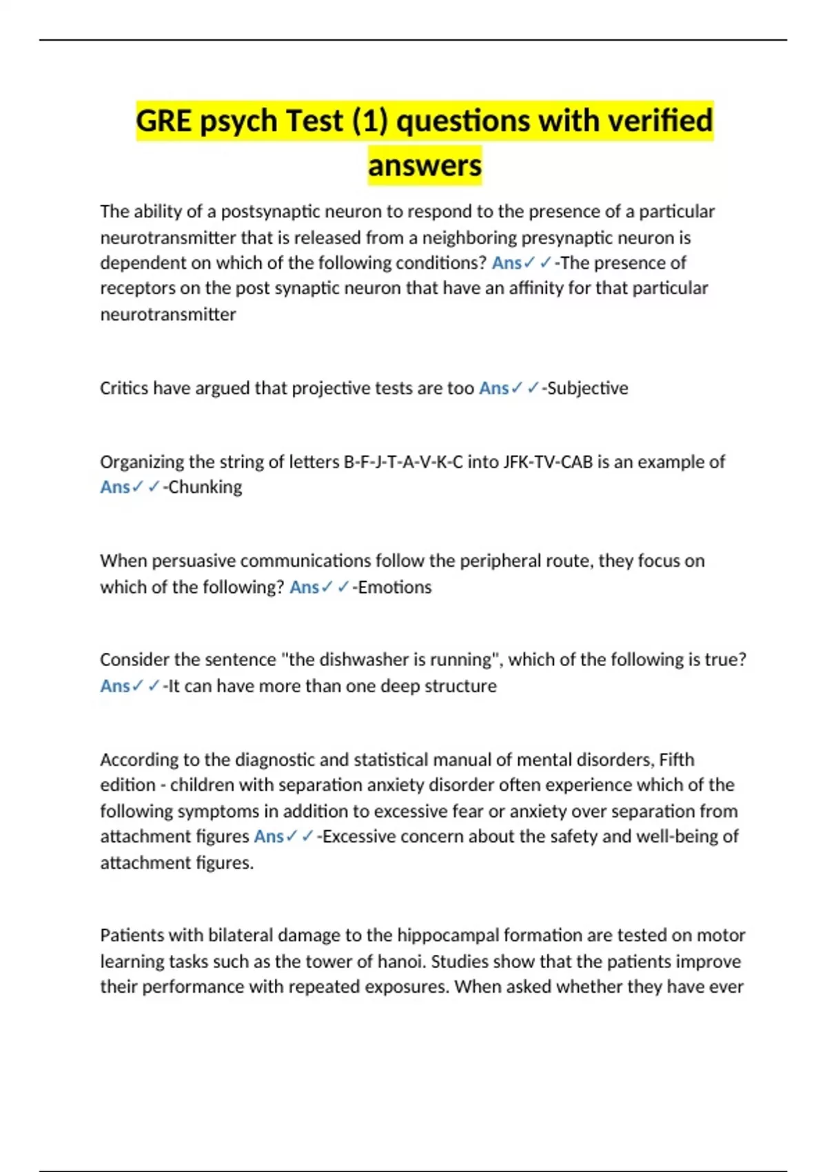 The ability of a postsynaptic neuron to respond to the presence of a particular neurotransmitter that is released from a neighboring presynaptic neuron is dependent on which of the following conditions? Ans-The presence of receptors on the post synaptic neuron that have an affinity for that particular neurotransmitter Critics have argued that projective tests are too Ans-Subjective Organizing the string of letters B-F-J-T-A-V-K-C into JFK-TV-CAB is an example of Ans-Chunking When persuasive communications follow the peripheral route, they focus on which of the following? Ans-Emotions Consider the sentence "the dishwasher is running", which of the following is true? Ans-It can have more than one deep structure According to the diagnostic and statistical manual of mental disorders, Fifth edition - children with separation anxiety disorder often experience which of the following symptoms in addition to excessive fear or anxiety over separation from attachment figures Ans-Excessive concern about the safety and well-being of attachment figures. Patients with bilateral damage to the hippocampal formation are tested on motor learning tasks such as the tower of hanoi. Studies show that the patients improve their performance with repeated exposures. When a