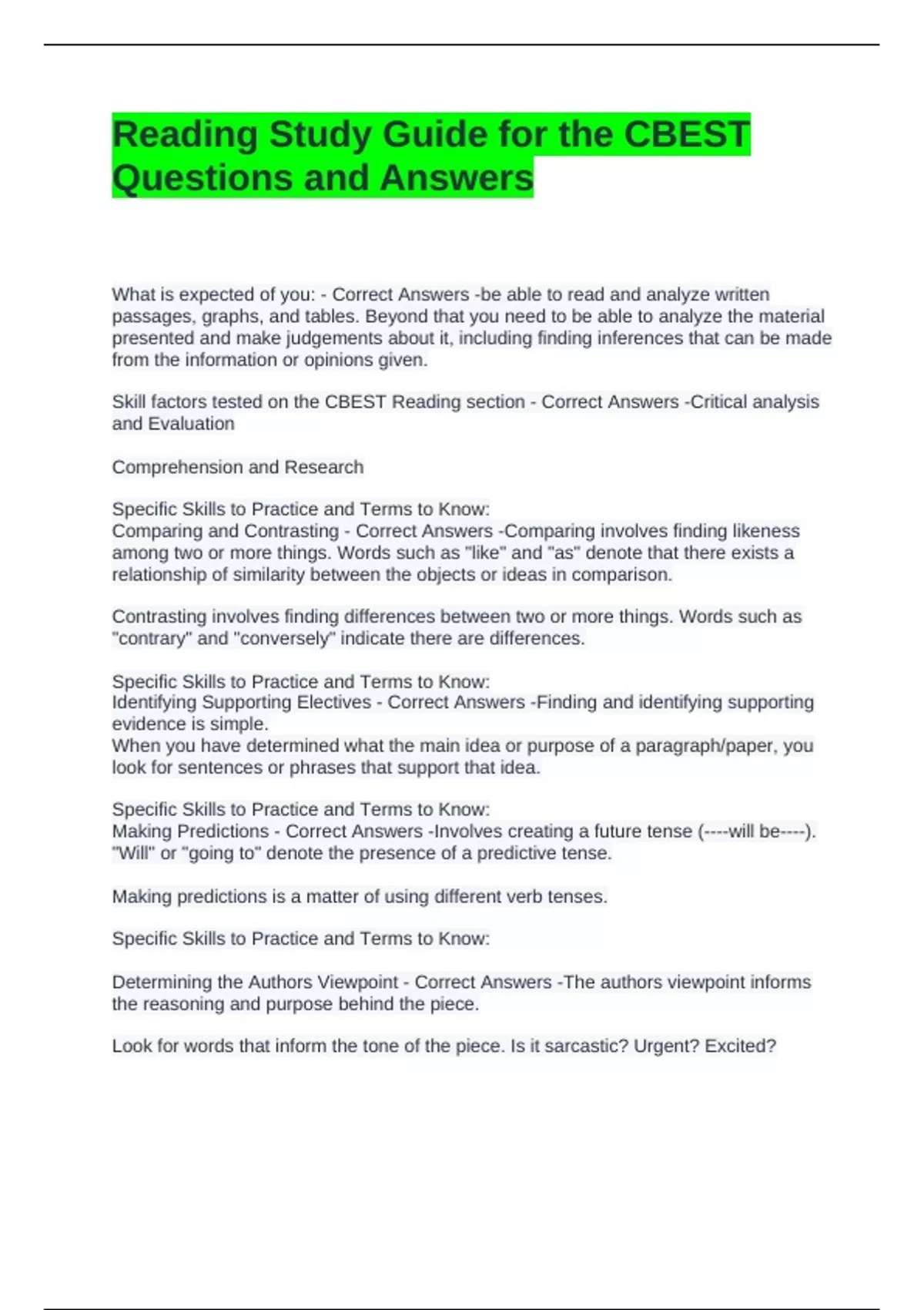 Skill factors tested on the CBEST Reading section - Correct Answers -Critical analysis