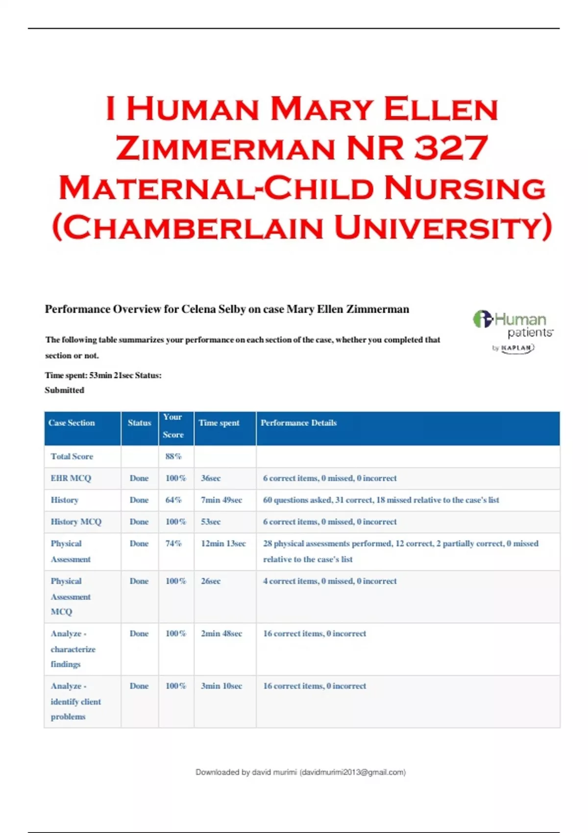 Performance Overview for Celena Selby on case Mary Ellen Zimmerman