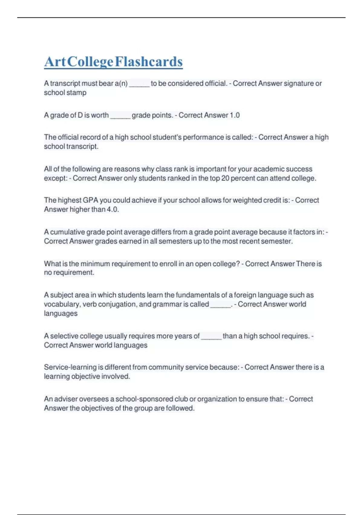 ArtCollegeFlashcards A transcript must bear a(n) _____ to be considered official. - Correct Answer signature or school stamp A grade of D is worth _____ grade points. - Correct Answer 1.0 The official record of a high school student's performance is called: - Correct Answer a high school transcript. All of the following are reasons why class rank is important for your academic success except: - Correct Answer only students ranked in the top 20 percent can attend college. The highest GPA you could achieve if your school allows for weighted credit is: - Correct Answer higher than 4.0.