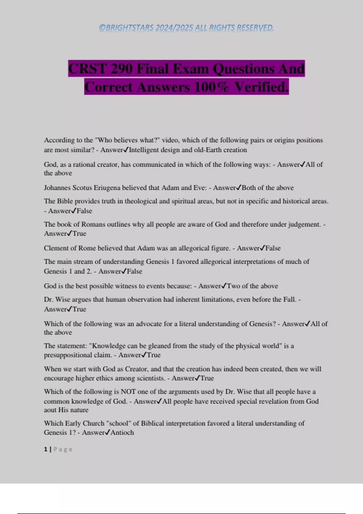 CRST 290 Final Exam Questions And Correct Answers 100% Verified. According to the "Who believes what?" video, which of the following pairs or origins positions are most similar? - AnswerIntelligent design and old-Earth creation God, as a rational creator, has communicated in which of the following ways: - AnswerAll of the above Johannes Scotus Eriugena believed that Adam and Eve: - AnswerBoth of the above The Bible provides truth in theological and spiritual areas, but not in specific and historical areas. - AnswerFalse The book of Romans outlines why all people are aware of God and therefore under judgement. - AnswerTrue Clement of Rome believed that Adam was an allegorical figure. - AnswerFalse The main stream of understanding Genesis 1 favored allegorical interpretations of much of Genesis 1 and 2. - AnswerFalse God is the best possible witness to events because: - AnswerTwo of the above Dr. Wise argues that human observation had inherent limitations, even before the Fall. - AnswerTrue Which of the following was an advocate for a literal understanding of Genesis? - AnswerAll of the above The statement: "Knowledge can be gleaned from the study of the physical world" is a presuppositional claim. - AnswerTrue When we start with God as Creator, and that the creation has indeed been created, then we will encourage higher ethics among scientists. - AnswerTrue Which of the following is NOT one of the arguments used by Dr. Wise that all people have a common knowledge of God. - AnswerAll people have received special revelation from God aout His nature Which Early Church "school" of Biblical interpretation favored a literal understanding of Genesis 1? - AnswerAntioch ©BRIGHTSTARS 2024/2025 ALL RIGHTS RESERVED. 2 | P a g e A "historico-grammatical" interpretation of scripture takes the meaning of the test as plainly understood, given context, language, and author intent. - AnswerTrue It seems clear that the Bible's claims have _ authority compared to observations made my man. - Answermore There are no known Early Church authors who believed that the Earth was older than 10,000 years. - AnswerTrue According to the video on Genesis 1 and the Early Church, which Christian held to an allegorical interpretation of Genesis 1? - AnswerOrigen A statement that is considered true before beginning study of some topic is called a(n): - AnswerPresupposition The dates for the age of Adam, Noah, and others presented in Dr. Wise' book come from which manuscript of the Old Testament? - AnswerMasoretic Text When we start with God as Creator, and that the creation has indeed been created, then this will increase our knowledge of the world, but make synthesis of different branches of knowledge more difficult. - AnswerFalse Scientists and others enter into disciplines without considering the philosophical foundations and views within the disclipline - AnswerTrue A creation perspective recognizes that God: - AnswerAll of the above The early Reformation saw a strong resurgence of a literal understanding of Genesis. - AnswerTrue When God created us, He created us with the ability to construct our own wrong ideas and beliefs. - AnswerTrue Which of the following is/are reasons to take the creation account in Genesis 1 as historical: - AnswerOther writers of Scripture refer to Genesis as historical Historical sciences are most similar to: - AnswerDetective work Peter writes in II Peter that Jesus' return and final judgement will really happen because of which past event: - AnswerNo