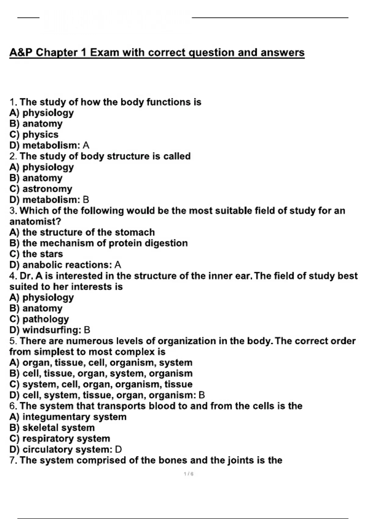 A&P Chapter 1 Exam with correct question and answers 1. The study of how the body functions is A) physiology B) anatomy C) physics D) metabolism: A 2. The study of body structure is called A) physiology B) anatomy C) astronomy D) metabolism: B 3. Which of the following would be the most suitable field of study for an anatomist?