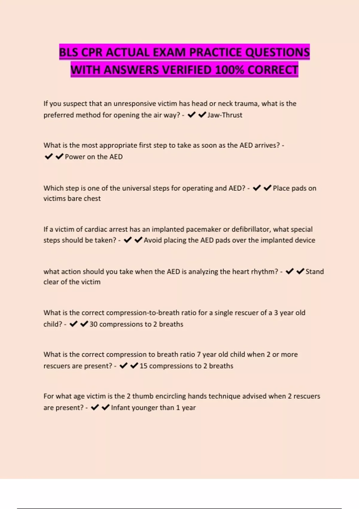 BLS CPR ACTUAL EXAM PRACTICE QUESTIONS WITH ANSWERS VERIFIED 100% CORRECT