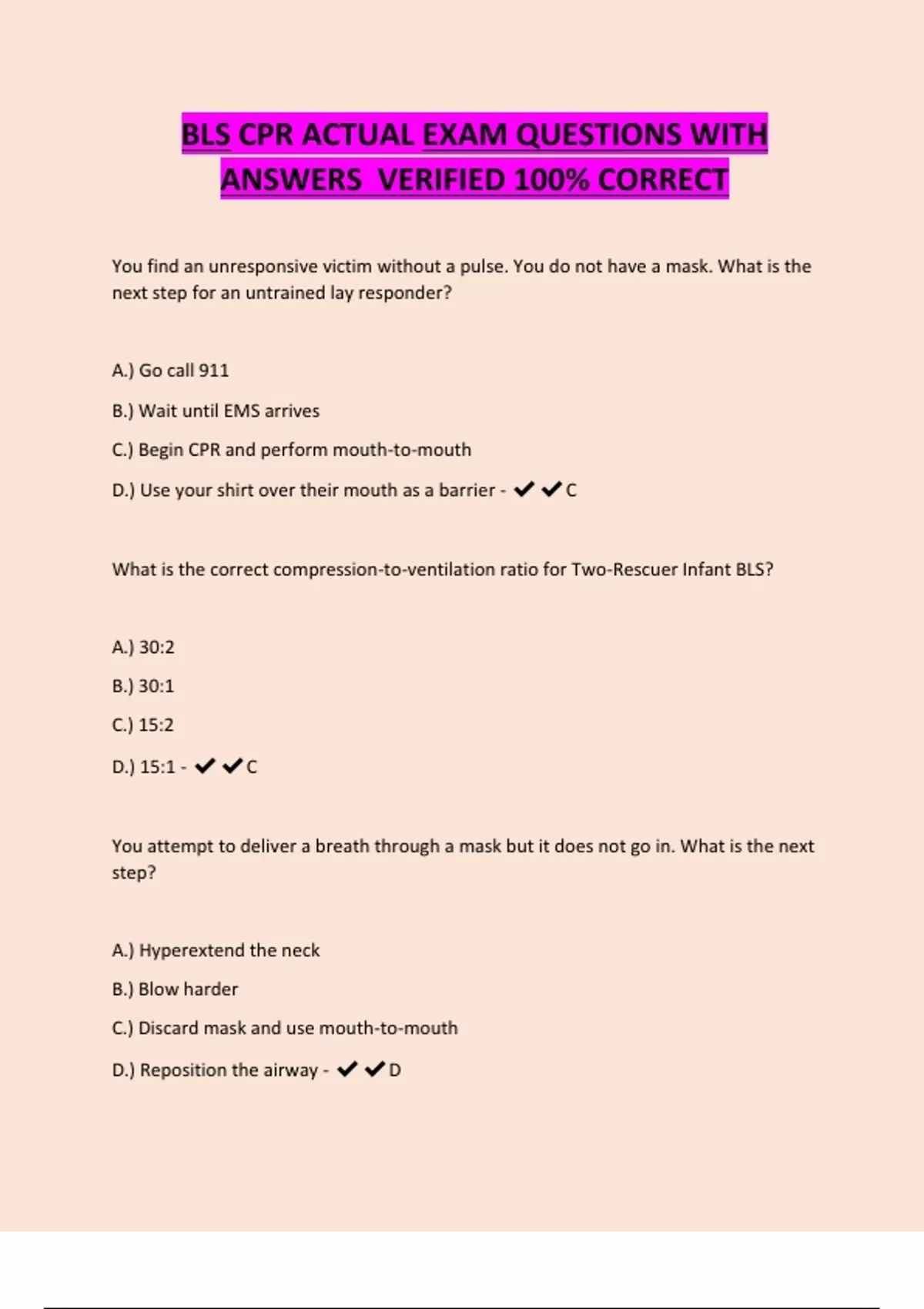 BLS CPR ACTUAL EXAM QUESTIONS WITH