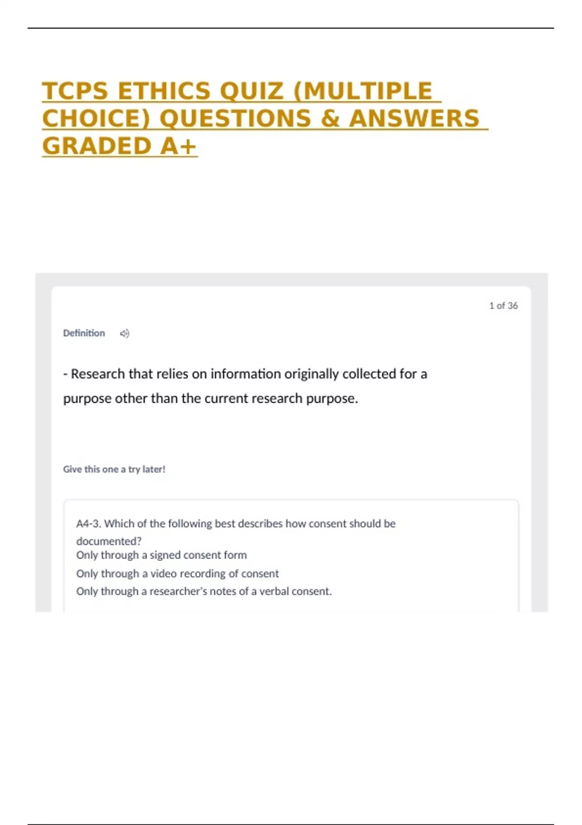 TCPS ETHICS QUIZ (MULTIPLE CHOICE) QUESTIONS & ANSWERS GRADED A+
