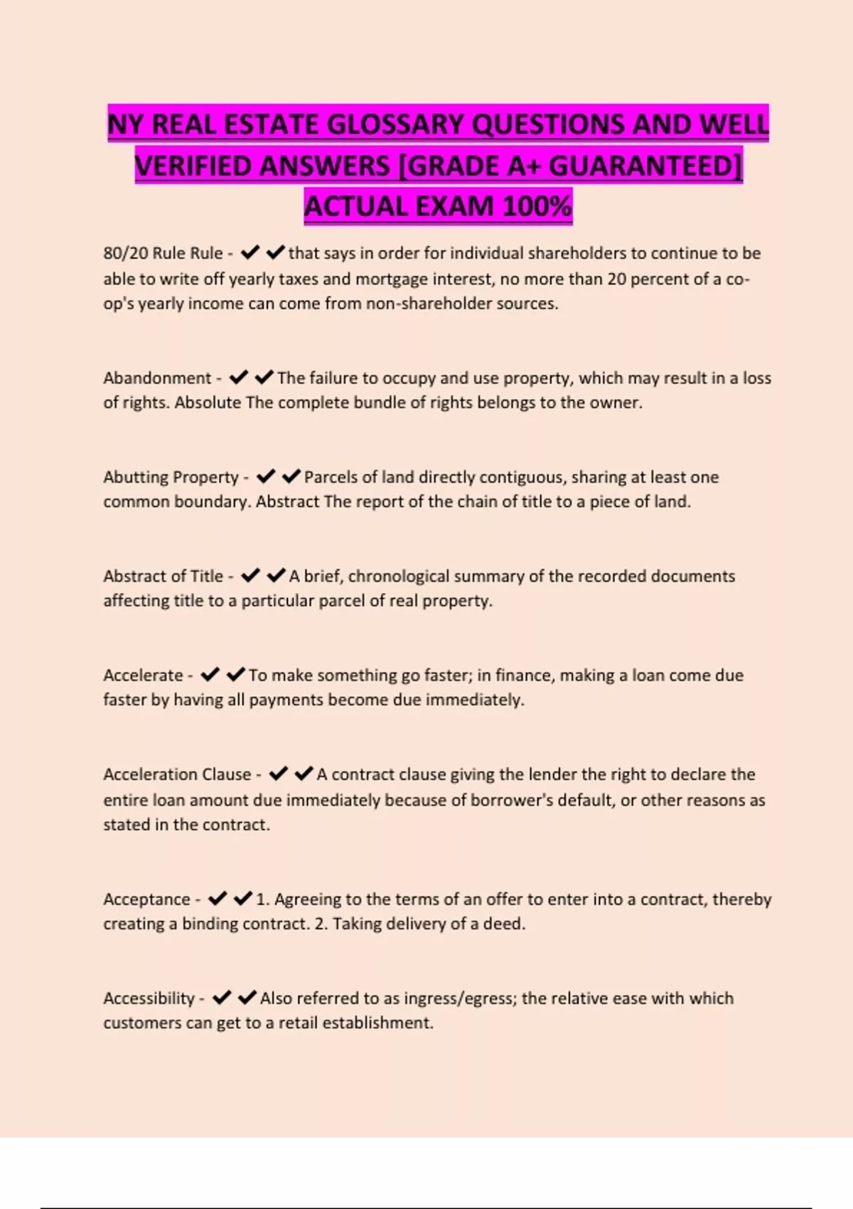 NY REAL ESTATE GLOSSARY QUESTIONS AND WELL VERIFIED ANSWERS [GRADE A+ GUARANTEED] ACTUAL EXAM 100%