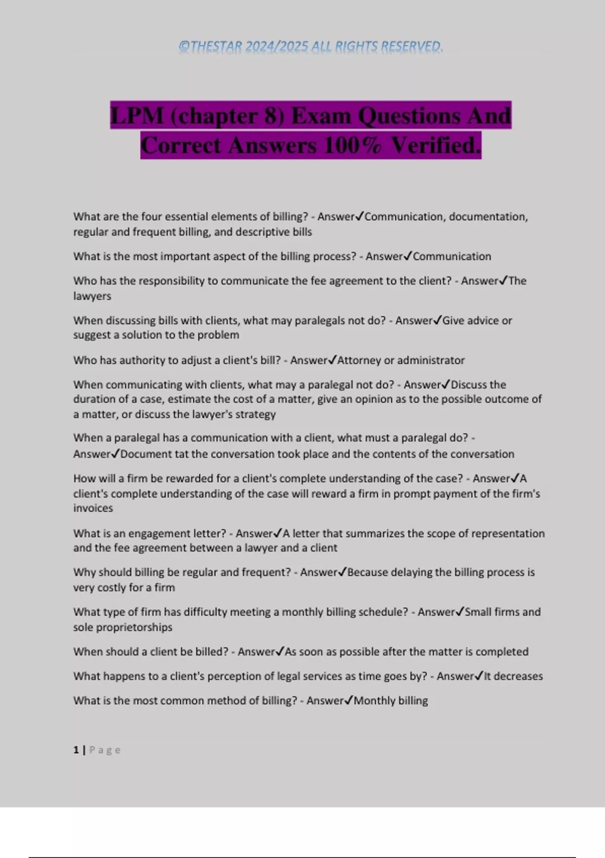 LPM (chapter 8) Exam Questions And Correct Answers 100% Verified. What are the four essential elements of billing? - AnswerCommunication, documentation, regular and frequent billing, and descriptive bills What is the most important aspect of the billing process? - AnswerCommunication Who has the responsibility to communicate the fee agreement to the client? - AnswerThe lawyers When discussing bills with clients, what may paralegals not do? - AnswerGive advice or suggest a solution to the problem Who has authority to adjust a client's bill? - AnswerAttorney or administrator When communicating with clients, what may a paralegal not do? - AnswerDiscuss the duration of a case, estimate the cost of a matter, give an opinion as to the possible outcome of a matter, or discuss the lawyer's strategy When a paralegal has a communication with a client, what must a paralegal do? - AnswerDocument tat the conversation took place and the contents of the conversation How will a firm be rewarded for a client's complete understanding of the case? - AnswerA client's complete understanding of the case will reward a firm in prompt payment of the firm's invoices What is an engagement letter? - AnswerA letter that summarizes the scope of representation and the fee agreement between a lawyer and a client Why should billing be regular and frequent? - AnswerBecause delaying the billing process is very costly for a firm What type of firm has difficulty meeting a monthly billing schedule? - AnswerSmall firms and sole proprietorships When should a client be billed? - AnswerAs soon as possible after the matter is completed What happens to a client's perception of legal services as time goes by? - AnswerIt decreases What is the most common