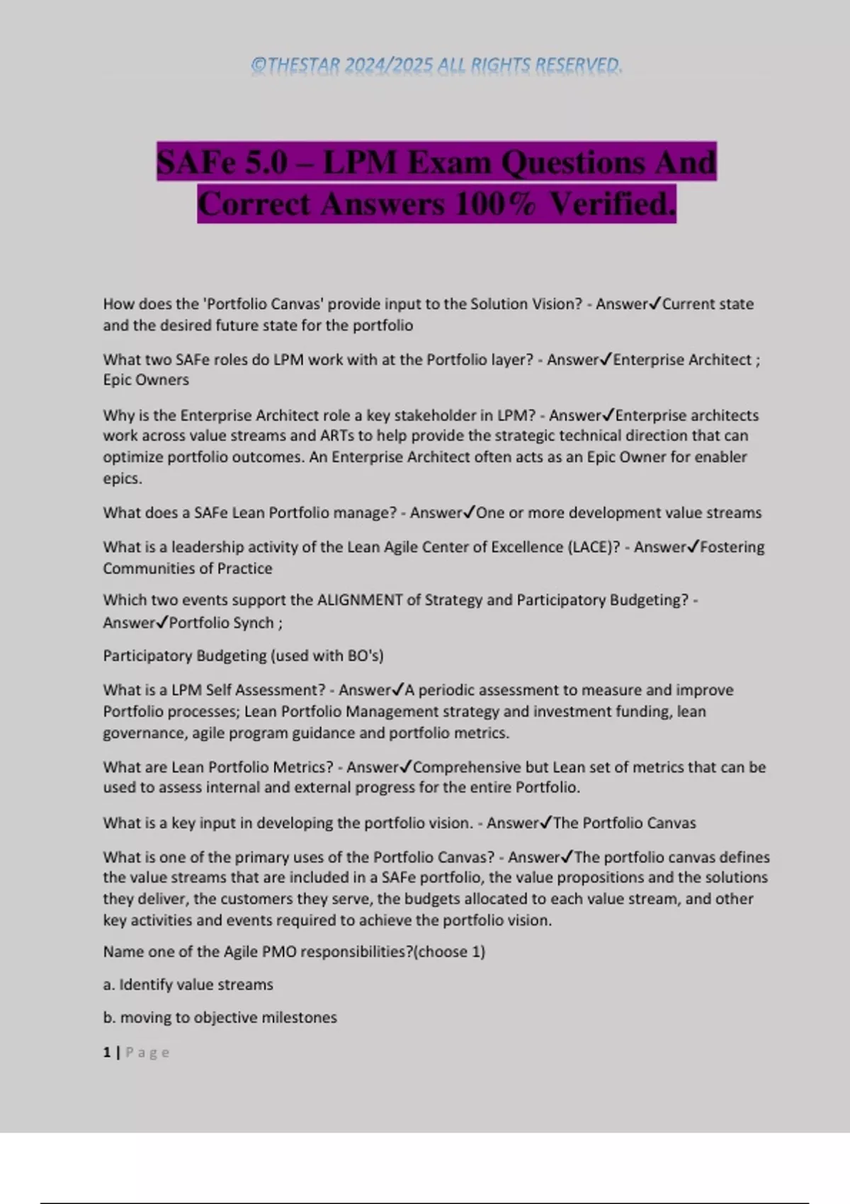 SAFe 5.0 – LPM Exam Questions And Correct Answers 100% Verified. How does the 'Portfolio Canvas' provide input to the Solution Vision? - AnswerCurrent state and the desired future state for the portfolio What two SAFe roles do LPM work with at the Portfolio layer? - AnswerEnterprise Architect ; Epic Owners Why is the Enterprise Architect role a key stakeholder in LPM? - AnswerEnterprise architects work across value streams and ARTs to help provide the strategic technical direction that can optimize portfolio outcomes. An Enterprise Architect often acts as an Epic Owner for enabler epics. What does a SAFe Lean Portfolio manage? - AnswerOne or more development value streams What is a leadership activity of the Lean Agile Center of Excellence (LACE)? - AnswerFostering Communities of Practice Which two events support the ALIGNMENT of Strategy and Participatory Budgeting? - AnswerPortfolio Synch ; Participatory Budgeting (used with BO's) What is a LPM Self Assessment? - AnswerA periodic assessment to measure and improve Portfolio processes; Lean Portfolio Management strategy and investment funding, lean governance, agile program guidance and portfolio metrics. What are Lean Portfolio Metrics? - AnswerComprehensive but Lean set of metrics that can be used to assess internal and external progress for the entire Portfolio. What is a key input in developing the portfolio vision. - AnswerThe Portfolio Canvas What is one of the primary uses of the Portfolio Canvas? - AnswerThe portfolio canvas defines the value streams that are included in a SAFe portfolio, the value propositions and the solutions they deliver, the customers they serve, the budgets allocated to each value stream, and other key activities and events required to achieve the portfolio vision. Name one of the Agile PMO responsibilities?(choose 1) a. Identify value streams b. moving to objective milesto