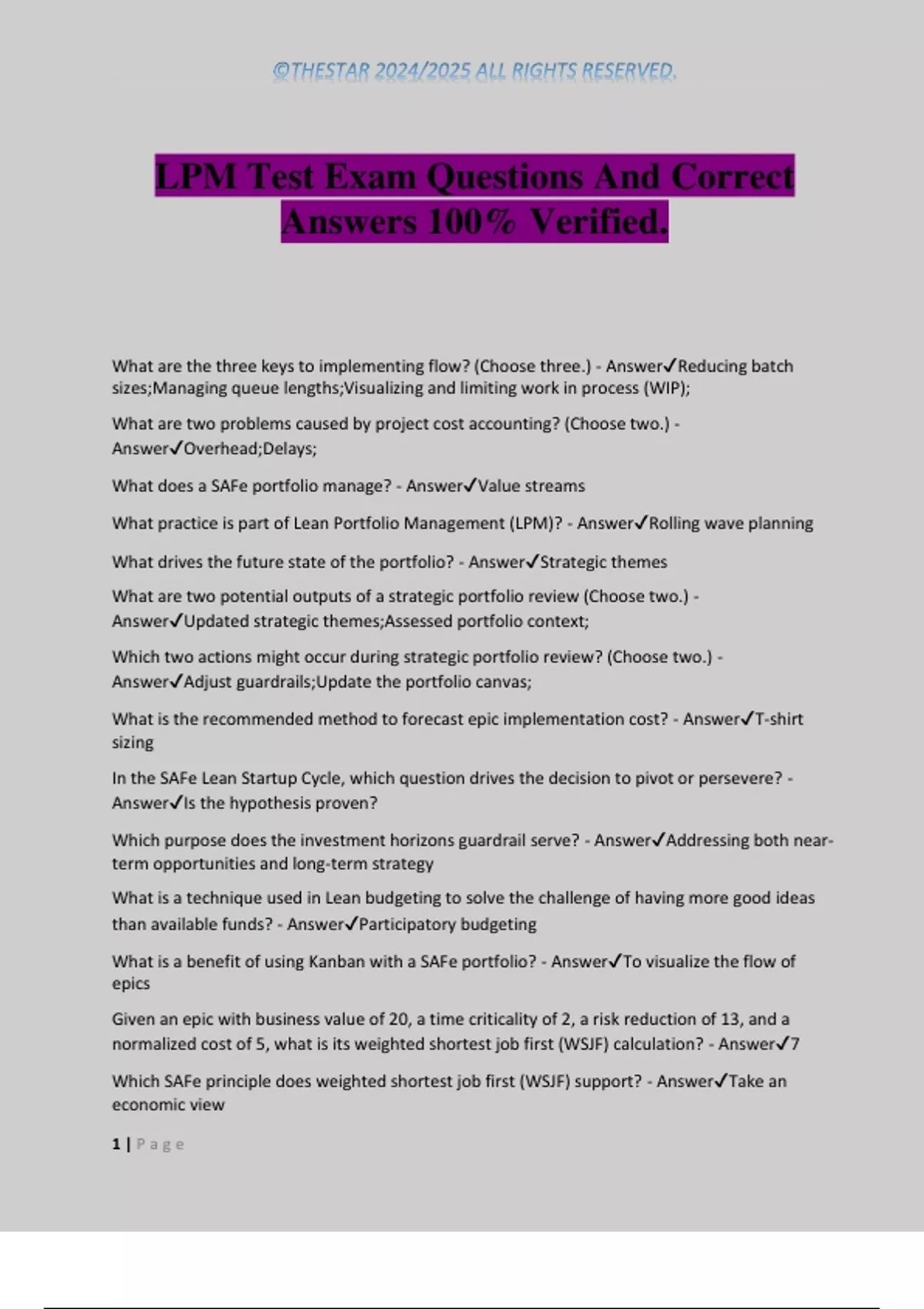 LPM Test Exam Questions And Correct Answers 100% Verified. What are the three keys to implementing flow? (Choose three.) - AnswerReducing batch sizes;Managing queue lengths;Visualizing and limiting work in process (WIP); What are two problems caused by project cost accounting? (Choose two.) - AnswerOverhead;Delays; What does a SAFe portfolio manage? - AnswerValue streams What practice is part of Lean Portfolio Management (LPM)? - AnswerRolling wave planning What drives the future state of the portfolio? - AnswerStrategic themes What are two potential outputs of a strategic portfolio review (Choose two.) - AnswerUpdated strategic themes;Assessed portfolio context; Which two actions might occur during strategic portfolio review? (Choose two.) - AnswerAdjust guardrails;Update the portfolio canvas; What is the recommended method to forecast epic implementation cost? - AnswerT-shirt sizing In the SAFe Lean Startup Cycle, which question drives the decision to pivot or persevere? - AnswerIs the hypothesis proven? Which purpose does the investment horizons guardrail serve? - AnswerAddressing both near- term opportunities and long-term strategy What is a technique used in Lean budgeting to solve the challenge of having more good ideas than available funds? - AnswerParticipatory budgeting What is a benefit of using Kanban with a SAFe portfolio? - AnswerTo visualize the flow of epics Given an epic with business value of 20, a time criticality of 2, a risk reduction of 13, and a normalized cost of 5, what is its weighted shortest job first (WSJF) calculation? - Answer7 Which SAFe principle doe
