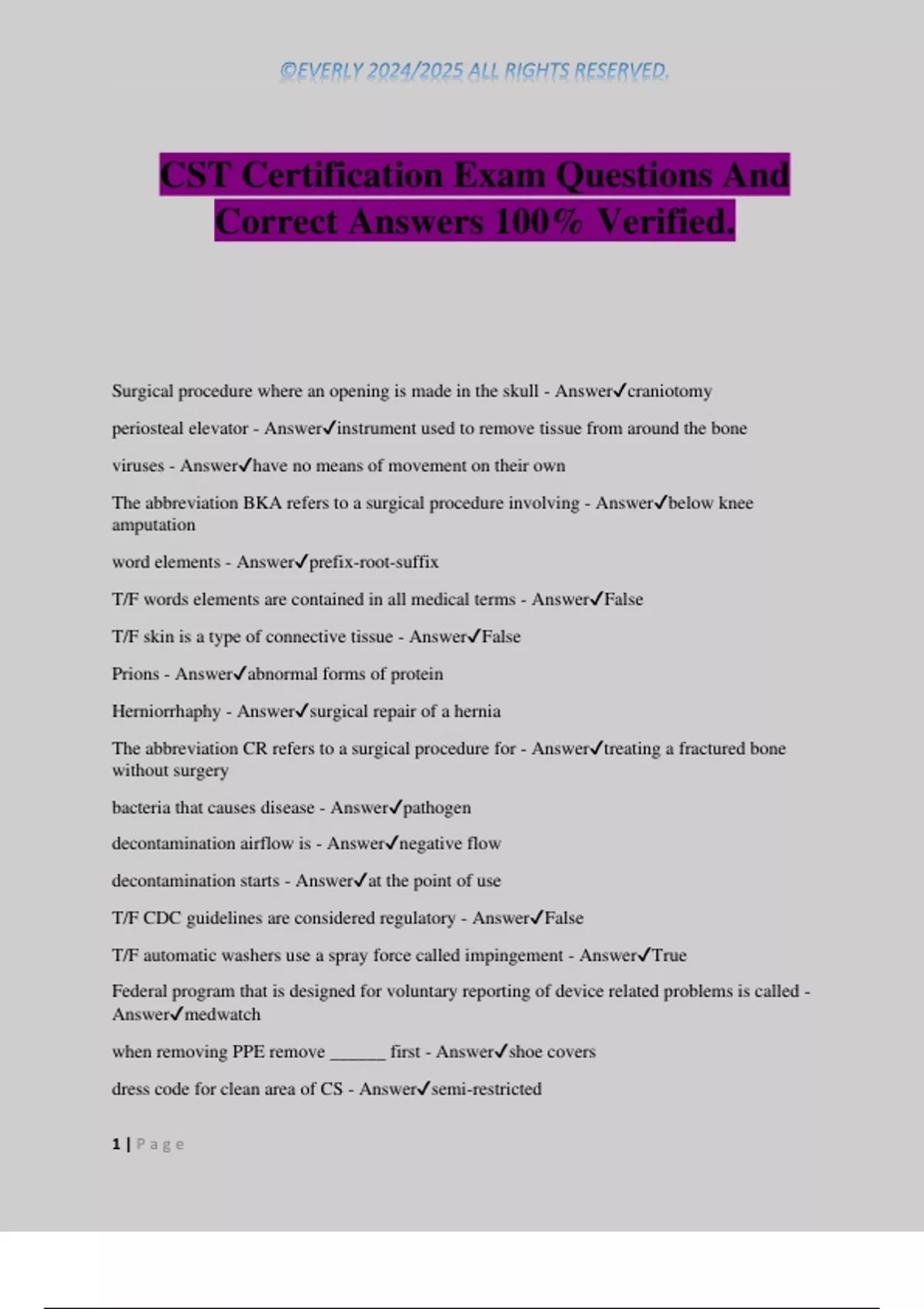 CST Certification Exam Questions And Correct Answers 100% Verified. Surgical procedure where an opening is made in the skull - Answercraniotomy periosteal elevator - Answerinstrument used to remove tissue from around the bone viruses - Answerhave no means of movement on their own The abbreviation BKA refers to a surgical procedure involving - Answerbelow knee amputation word elements - Answerprefix-root-suffix T/F words elements are contained in all medical terms - AnswerFalse T/F skin is a type of connective tissue - AnswerFalse Prions - Answerabnormal forms of protein Herniorrhaphy - Answersurgical repair of a hernia The abbreviation CR refers to a surgical procedure for - Answertreating a fractured bone without surgery bacteria that causes disease - Answerpathogen decontamination airflow is - Answernegative flow decontamination starts - Answerat the point of use T/F CDC guidelines are considered regulatory - AnswerFalse T/F automatic washers use a spray force called impingement - AnswerTrue Federal program that is designed for voluntary reporting of device related problems is called - Answermedwatch when removing PPE remove ______ first - Answershoe covers dress code for clean area of CS - Answersemi-restricted ©EVERLY 2024/2025 ALL RIGHTS RESERVED. 2 | P a g e Association of periOperative Registered Nurses - Answerorganization that writes guidelines for the operating room T/F When putting on PPE put the mask on first - AnswerFalse T/F prion contaminated instruments require no special cleaning - AnswerFalse When cleaning items contaminated with pseudomonas - AnswerThere are no special requirements purpose of learning medical terminology - Answerto provide the Operating Room and medical staff with the goods and services they need T/F all CS departments perform the same basic services - AnswerFalse If soiled instruments have to be transported offsite - AnswerFollow the us department of transportation guidelines detergents used in mechanical cleaners should be - Answerlow foaming A system is - Answera group of organs system used to categorize care based on risk of infection - Answerspaulding classification system T/F positive air flow means when the door is opened, air flows out instead of in - AnswerTrue dark areas on the end of a endoscope are - Answerdamaged light fibers pasteurizers disinfect using - Answerheated water T/F viruses are larger than bacteria - AnswerFalse Devices categorized as semi critical items must at least be _____ prior to use - Answerhigh level disinfected Temperature in the decontamination area should be - Answer60-65 Kerrison/laminectomy rongeurs should be tested using - Answerindex card Test strips should be used for a high level disinfectant - Answereach time of use Arthroscopy instruments are used during - Answerjoint surgery Bacteria that does NOT require oxygen to live - Answeranaerobic Instruments with tungsten carbide jaws can be easily identified by - Answergold handles used to breakdown fatty tissues on