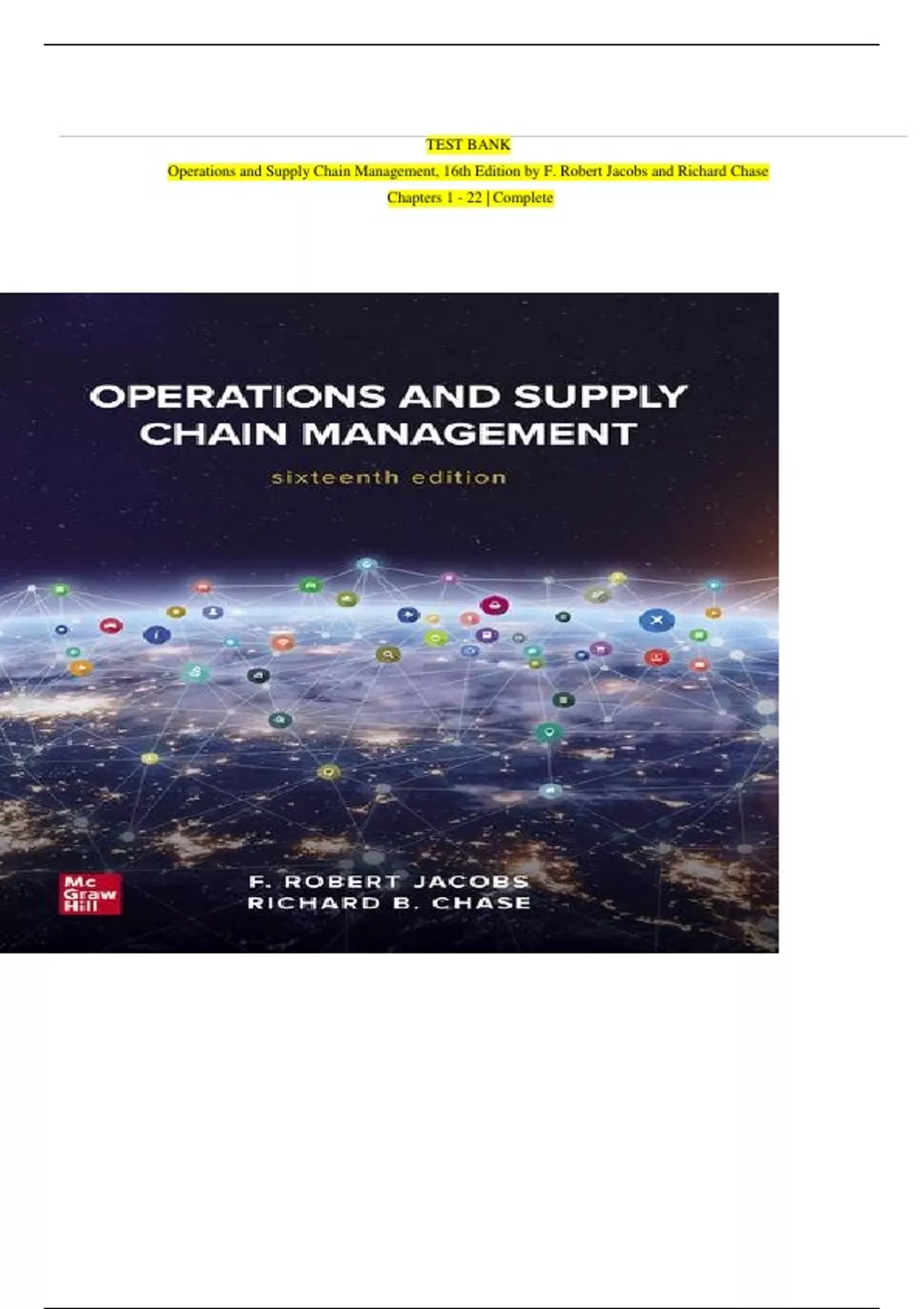 Enhance your exam performance with the Test Bank for Operations and Supply Chain Management, 16th Edition by F. Robert Jacobs & Richard B. Chase – Latest Version. This comprehensive and verified test bank includes hundreds of multiple-choice, true/false, and scenario-based questions that mirror the structure and content of the textbook. Covering key topics such as process strategy, supply chain design, inventory systems, global operations, lean manufacturing, quality management, forecasting, and service operations, this test bank is ideal for business, management, and supply chain students. All questions are crafted to reflect real-world applications and tested for accuracy, making this resource essential for mastering complex concepts and excelling in coursework and certification exams. Perfect for quizzes, midterms, finals, or focused chapter-by-chapter review.