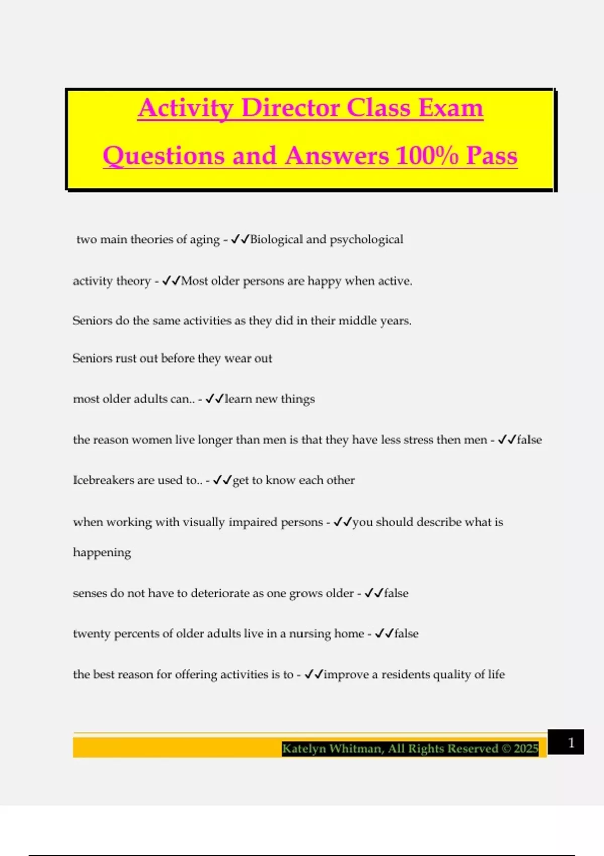 Activity Director Class Exam Questions and Answers 100% Pass two main theories of aging - Biological and psychological activity theory - Most older persons are happy when active. Seniors do the same activities as they did in their middle years. Seniors rust out before they wear out most older adults can.. - learn new things the reason women live longer than men is that they have less stress then men - false Icebreakers are used to.. - get to know each other when working with visually impaired persons - you should describe what is happening senses do not have to deteriorate as one grows older - false twenty percents of older adults live in a nursing home - false the best reason for offering activities is to - improve a residents quality of life 2Katelyn Whitman, All Rights Reserved © 2025 the activity program must provide - activities which make maximum use of each person's capabilities activity qualifications for activity professionals was established in - 1987 a key aspect of an activity director is to delegate - true the environment is the most important part of improving part a residents quality of life - false if possible the way to understand an individual is to interview them - true Expressive activities - exercise to music dance music drama and art painting, ceramics, and plaster of Paris emphasis on individuality and communication characteristics of depression are anger and pessimism - true