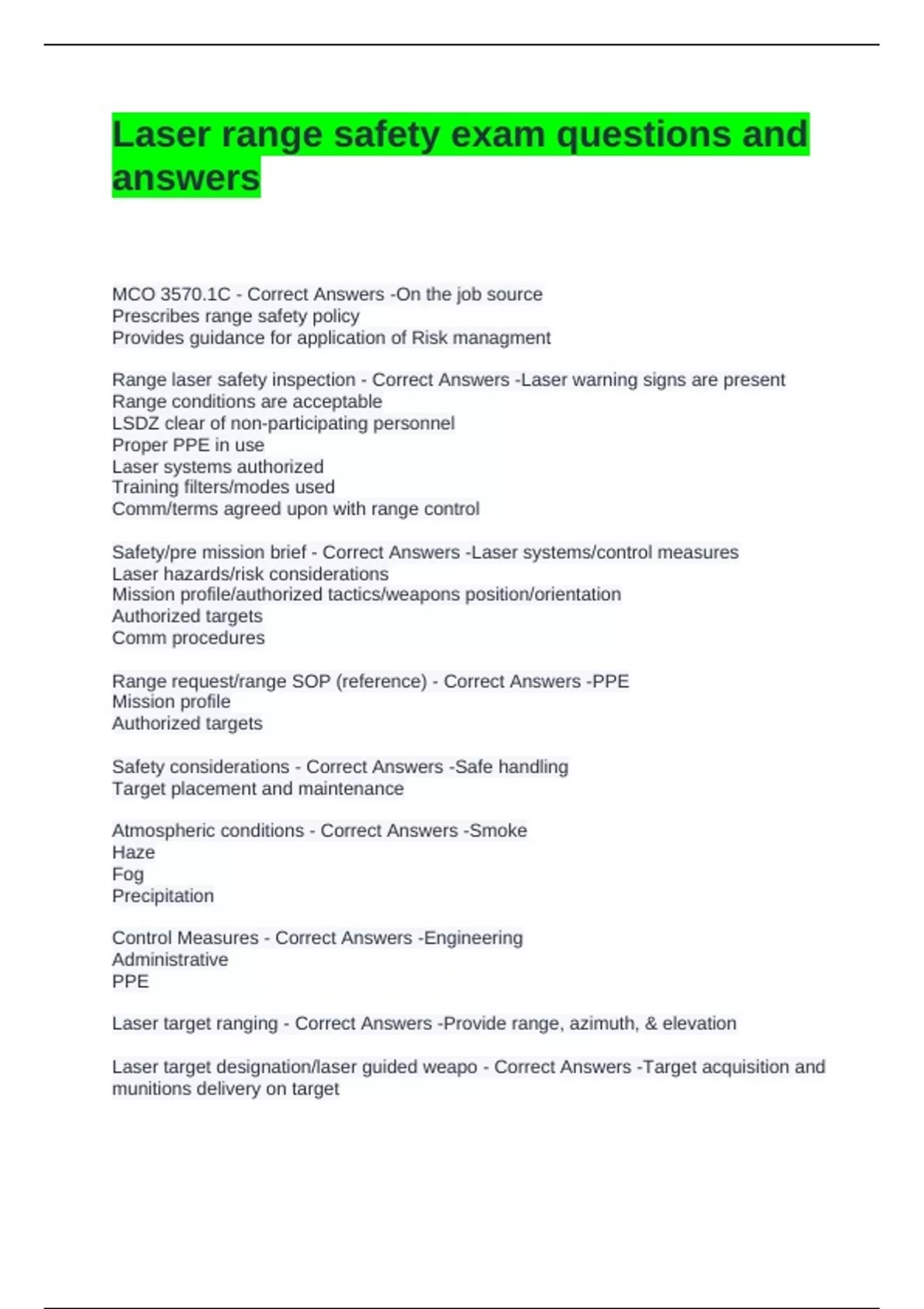 Safety/pre mission brief - Correct Answers -Laser systems/control measures