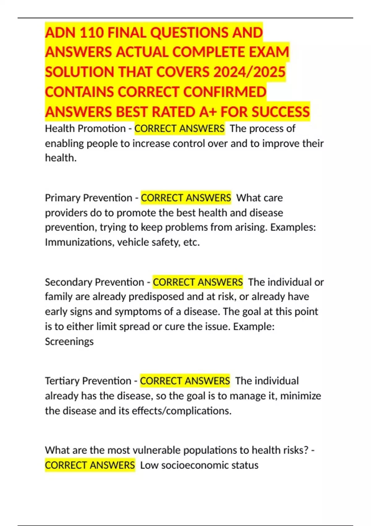 ADN 110 FINAL QUESTIONS AND ANSWERS ACTUAL COMPLETE EXAM SOLUTION THAT COVERS 2024/2025 CONTAINS CORRECT CONFIRMED ANSWERS BEST RATED A+ FOR SUCCESS
