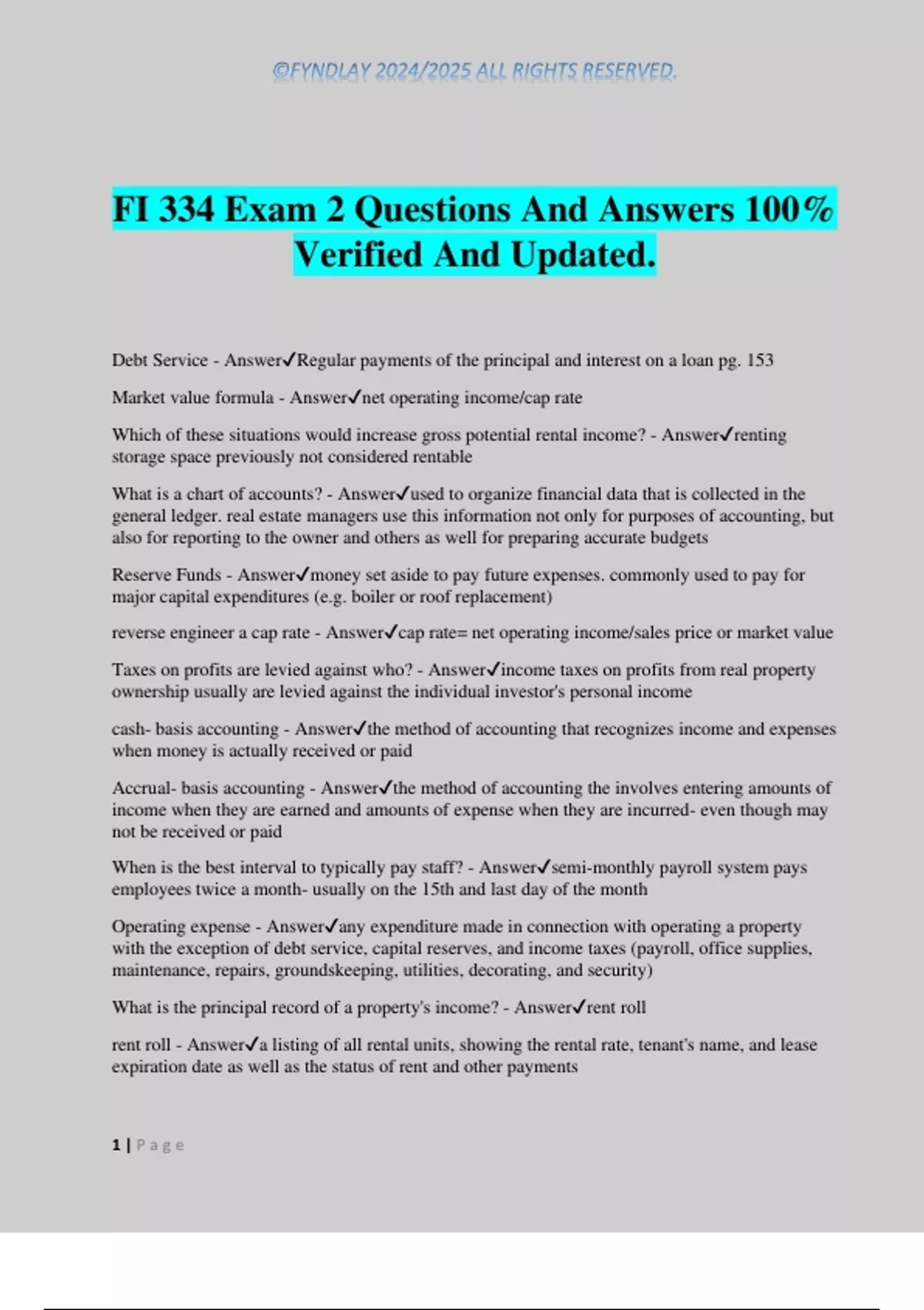FI 334 Exam 2 Questions And Answers 100% Verified And Updated. Debt Service - AnswerRegular payments of the principal and interest on a loan pg. 153 Market value formula - Answernet operating income/cap rate Which of these situations would increase gross potential rental income? - Answerrenting storage space previously not considered rentable What is a chart of accounts? - Answerused to organize financial data that is collected in the general ledger. real estate managers use this information not only for purposes of accounting, but also for reporting to the owner and others as well for preparing accurate budgets Reserve Funds - Answermoney set aside to pay future expenses. commonly used to pay for major capital expenditures (e.g. boiler or roof replacement) reverse engineer a cap rate - Answercap rate= net operating income/sales price or market value Taxes on profits are levied against who? - Answerincome taxes on profits from real property ownership usually are levied against the individual investor's personal income cash- basis accounting - Answerthe method of accounting that recognizes income and expenses when money is actually received or paid Accrual- basis accounting - Answerthe method of accounting the involves entering amounts of income when they are earned and amounts of expense when they are incurred- even though may not be received or paid When is the best interval to typically pay staff? - Answersemi-monthly payroll system pays employees twice a month- usually on the 15th and last day of the month Operating expense - Answerany expenditure made in connection with operating a property with the exception of debt service, capital reserves, and income taxes (payroll, office supplies, maintenance, repairs, groundskeeping, utilities, decorating, and security) What is the principal record of a property's income? - Answerrent roll rent roll - Answera listing of all rental