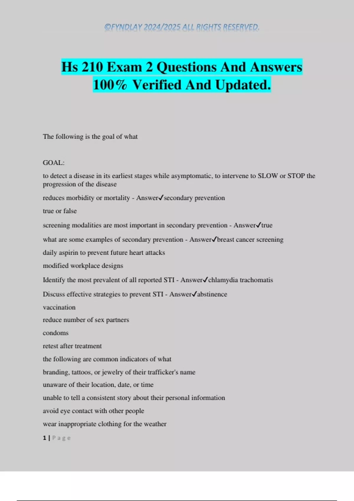 Hs 210 Exam 2 Questions And Answers 100% Verified And Updated. The following is the goal of what GOAL: to detect a disease in its earliest stages while asymptomatic, to intervene to SLOW or STOP the progression of the disease reduces morbidity or mortality - Answersecondary prevention true or false screening modalities are most important in secondary prevention - Answertrue what are some examples of secondary prevention - Answerbreast cancer screening daily aspirin to prevent future heart attacks modified workplace designs Identify the most prevalent of all reported STI - Answerchlamydia trachomatis Discuss effective strategies to prevent STI - Answerabstinence vaccination reduce number of sex partners condoms retest after treatment the following are common indicators of what branding, tattoos, or jewelry of their trafficker's name unaware of their location, date, or time unable to tell a consistent story about their personal information avoid eye contact with other people wear inappropriate clothing for the weather ©FYNDLAY 2024/2025 ALL RIGHTS RESERVED. 2 | P a g e exhibit signs of unexplained physical abuse accompanied by older, controlling individuals have excessive cash or unexplained expensive items - Answerhuman trafficking the following is a description of what runaway homeless often truant has a relationship with an older individual has low self-esteem/dependency issues - Answermarginalized youth def: sexual activity without consent, can occur in person, online, or through technology - Answersexual violence true or false the perpetrator of sexual violence is usually someone the victim knows - Answertrue Describe STI that can be passed to the baby of a pregnant woman if untreated. - Answercongenital syphilis can cause miscarriage, stillbirth, infant death, and lifelong medical issues babies born to be black, hispanic, or american indian/alaska native mothers were up to 8 times more likely to have newborn syphilis in 2021 than babies born to white mothers what is the leading cause of anemia - Answeriron deficiency Describe the issues associated with low levels of nutrients for infants and children. - Answermental impairment and CNS defects in infants micronutrients are not produced by the body contributes to costly diseases the following are guidelines for what focus on meeting food group needs wit