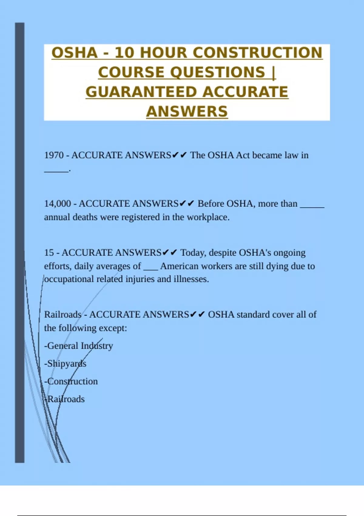 OSHA - 10 HOUR CONSTRUCTION COURSE QUESTIONS |GUARANTEED ACCURATE ANSWERS 1970 - ACCURATE ANSWERS The OSHA Act became law in _____. 14,000 - ACCURATE ANSWERS Before OSHA, more than _____ annual deaths were registered in the workplace. 15 - ACCURATE ANSWERS Today, despite OSHA's ongoing efforts, daily averages of ___ American workers are still dying due to occupational related injuries and illnesses. Railroads - ACCURATE ANSWERS OSHA standard cover all of the following except: -General Industry -Shipyards -Construction -Railroads The General Duty Clause - ACCURATE ANSWERS Section 5(a)(1) of the OSHA Act is referred to as the _____. Covers all activities - ACCURATE ANSWERS A horizontal standard is one that ____.