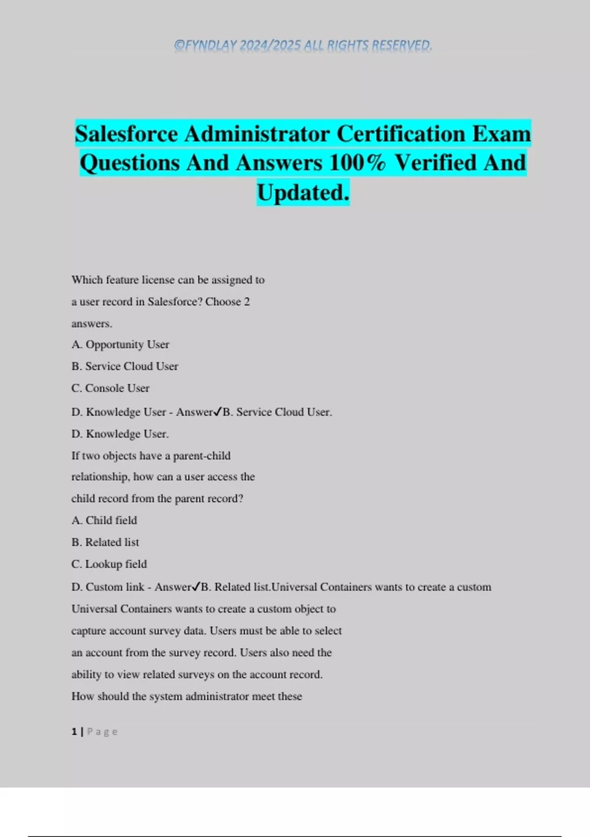 Salesforce Administrator Certification Exam Questions And Answers 100% Verified And Updated. Which feature license can be assigned to a user record in Salesforce? Choose 2 answers. A. Opportunity User B. Service Cloud User C. Console User D. Knowledge User - AnswerB. Service Cloud User. D. Knowledge User. If two objects have a parent-child relationship, how can a user access the child record from the parent record? A. Child field B. Related list C. Lookup field D. Custom link - AnswerB. Related list.Universal Containers wants to create a custom Universal Containers wants to create a custom object to capture account survey data. Users must be able to select an account from the survey record. Users also need the ability to view related surveys on the account record. How should the system administrator meet these ©FYNDLAY 2024/2025 ALL RIGHTS RESERVED. 2 | P a g e requirements Choose 2 answers A. Create a lookup relationship field on the account object. B. Add the account related list to the survey page layout. C. Create a lookup relationship field on the survey object. D. Add the survey related list to the account page layout - AnswerC. Create a lookup relationship field on the survey object. D. Add the survey related list to the account page layout. A user is having trouble logging into Salesforce. The users login history shows that this person has attempted to log in multiple times and has been locked out of the organization. How can the system administrator help the user log into Salesforce? Choose 2 answers - AnswerC. Click Reset Password on the user's record detail page. D. Click Unlock on the users record detail page. When importing data, what happens if some records do NOT meet the data validation criteria? A. Import process ignores the data validation criteria. B. Import process aborts when it encounters the first invalid record. C. Import process requires user authorization to import the invalid records. D. Import process fails only for the records with invalid data. - AnswerD. Import process fails only for the records with invalid data. The support team at Universal Containers wants to be more proactive about renewing support plans with ©FYNDLAY 2024/2025 ALL RIGHTS RESERVED. 3 | P a g e customers. They would like the support representative dedicated to each account to be notified a month before the accounts support plan expires. What should an administrator configure to meet this requirement? A. Auto-response rule B. Assignment rule C. Escalation rule D. Workflow rule - AnswerD. Workflow rule. What should be considered when configuring the lead conversion process? Choose 2 answers A. Custom lead fields can be mapped to custom object fields. B. Custom lead fields can be mapped to account, contact, and opportunity fields. C. Roll-up summary lead fields can be mapped to custom contact fields. D. Standard lead fields are automatically converted to account, contact, and opportunity fields - AnswerB. Custom lead fields can be mapped to account, contact, and opportunity fields. D. Standard lead fields are automatically converted to account, contact, and opportunity fields. What is the purpose of the AppExchange? Choose 2 answers A. Administrators can download and customize prebuilt dashboards and reports. B. Partners can download accounts and contacts to collaborate on sales deals.