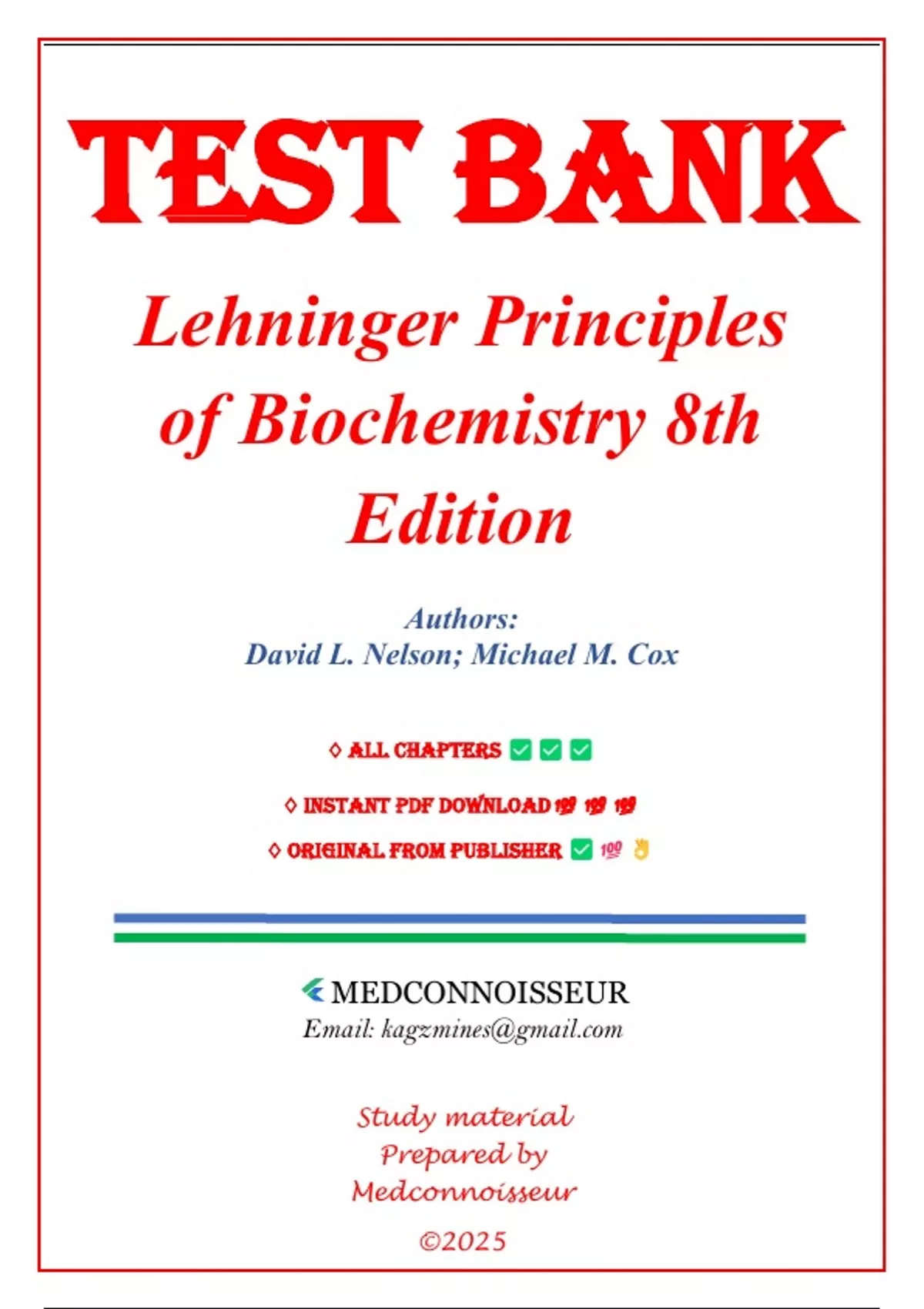 Test Bank Lehninger Principles of Biochemistry 8th Edition (Nelson, 2022) Chapter 1-28 | All Chapters. Full Chapters Include;.....1. The Foundations of Biochemistry I STRUCTURE AND CATALYSIS 2. Water, the Solvent of Life 3. Amino Acids, Peptides, and Proteins 4. The Three-Dimensional Structure of Proteins 5. Protein Function 6. Enzymes 7. Carbohydrates and Glycobiology 8. Nucleotides and Nucleic Acids 9. DNA-Based Information Technologies 10. Lipids 11. Biological Membranes and Transport 12. Biochemical Signaling II BIOENERGETICS AND METABOLISM 13. Introduction to Metabolism 14. Glycolysis, Gluconeogenesis, and the Pentose Phosphate Pathway 15. The Metabolism of Glycogen in Animals 16. The Citric Acid Cycle 17. Fatty Acid Catabolism 18. Amino Acid Oxidation and the Production of Urea 19. Oxidative Phosphorylation 20. Photosynthesis and Carbohydrate Synthesis in Plants 21. Lipid Biosynthesis 22. Biosynthesis of Amino Acids, Nucleotides, and Related Molecules 23. Hormonal Regulation and Integration of Mammalian Metabolism III INFORMATION PATHWAYS 24. Genes and Chromosomes 25. DNA Metabolism 26. RNA Metabolism 27. Protein Metabolism 28. Regulation of Gene Expression