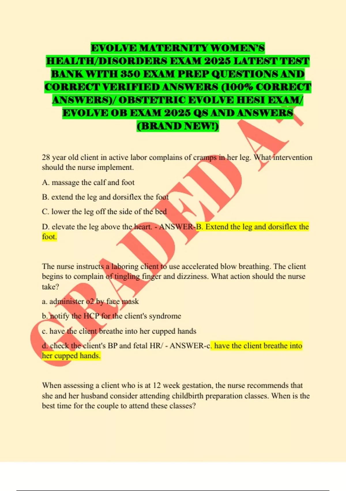 EVOLVE MATERNITY WOMEN’S HEALTH/DISORDERS EXAM 2025 LATEST TEST BANK WITH 350 EXAM PREP QUESTIONS AND CORRECT VERIFIED ANSWERS (100% CORRECT ANSWERS)/ OBSTETRIC EVOLVE HESI EXAM/ EVOLVE OB EXAM 2025 QS AND ANSWERS (BRAND NEW!)