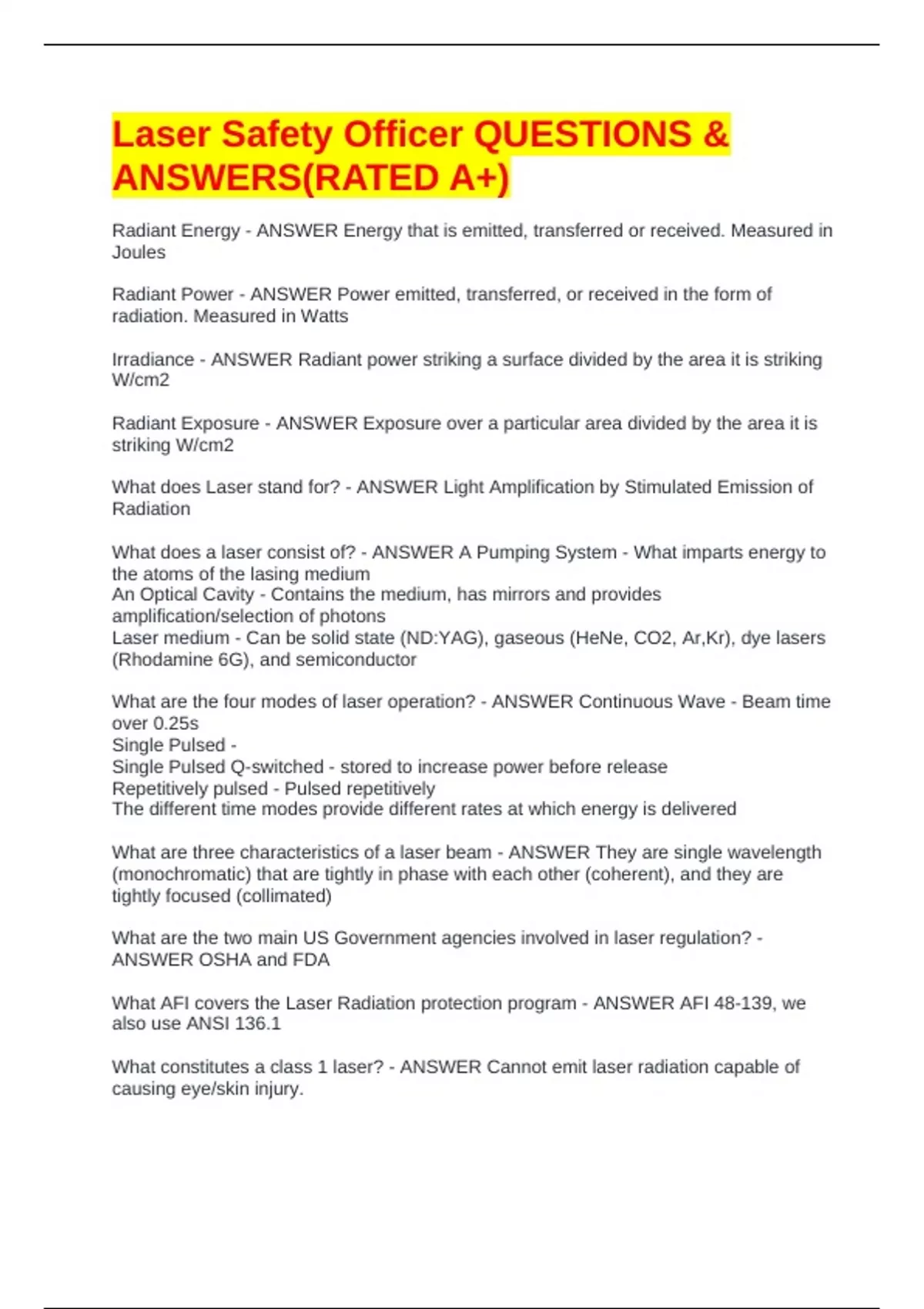 Laser Safety Officer QUESTIONS & ANSWERS(RATED A+)