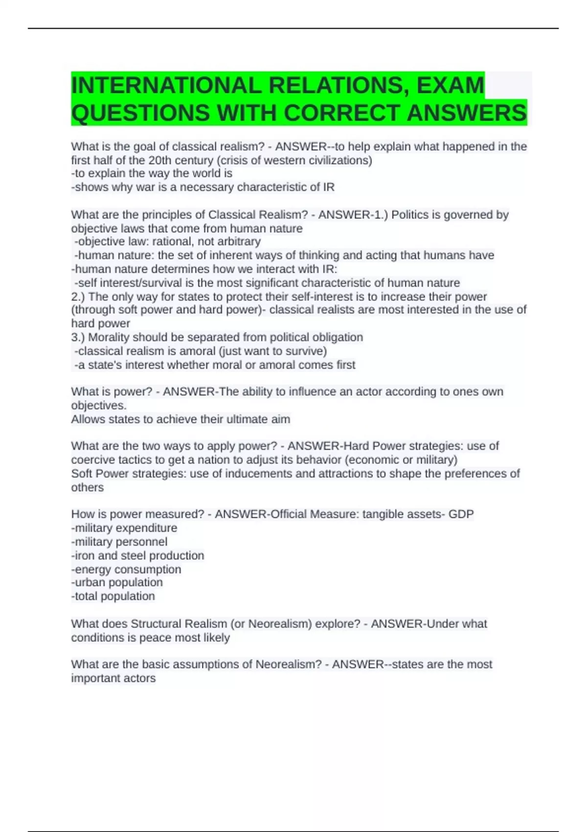INTERNATIONAL RELATIONS, EXAM QUESTIONS WITH CORRECT ANSWERS