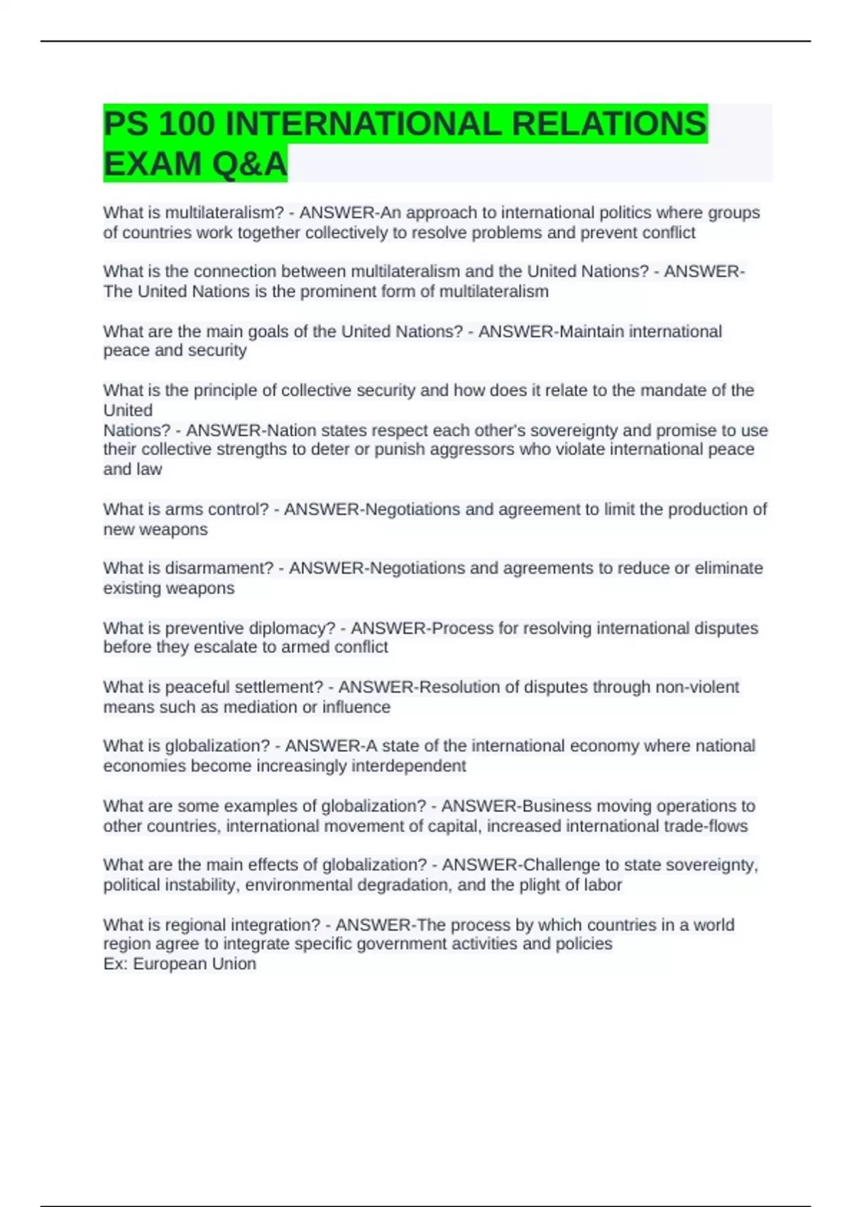PS 100 INTERNATIONAL RELATIONS EXAM Q&A