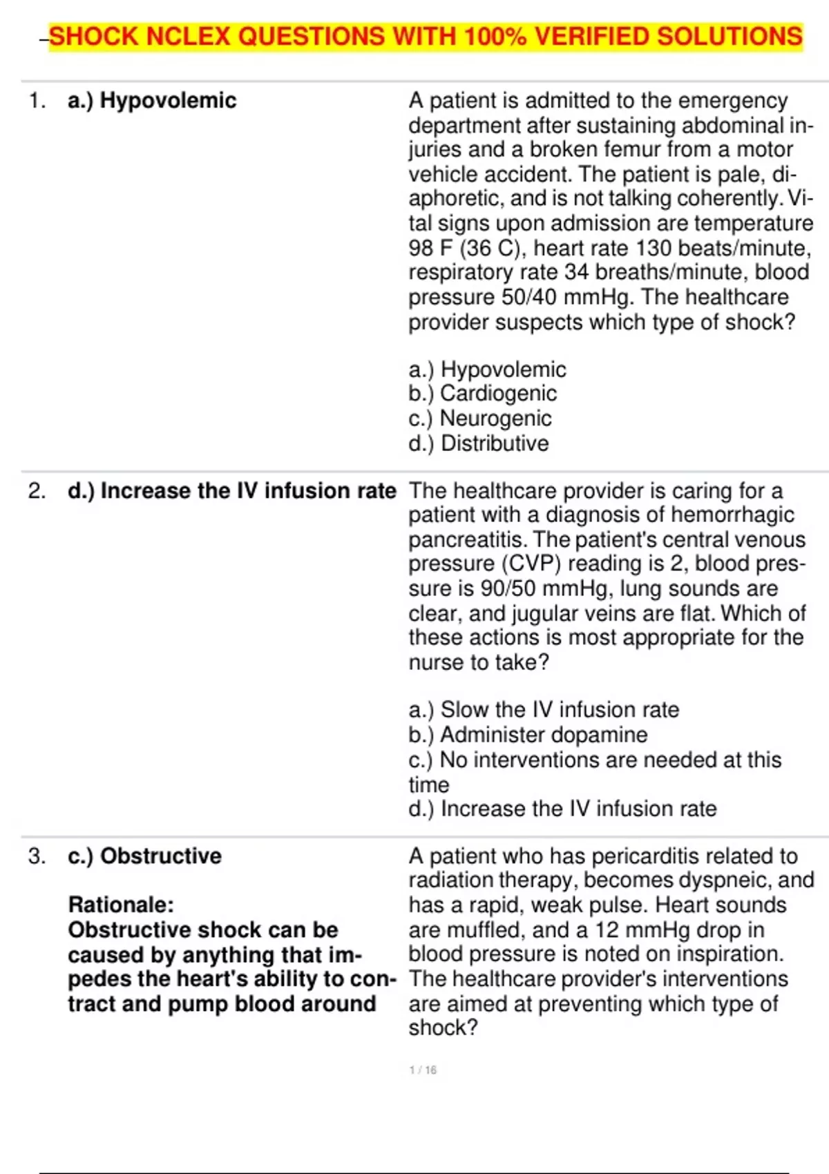 SHOCK NCLEX QUESTIONS WITH 100% VERIFIED SOLUTIONS 1. a.) Hypovolemic 2. d.) Increase the IV infusion rate 3. c.) Obstructive Rationale: Obstructive shock can be caused by anything that im- pedes the heart's ability to con- tract and pump blood around A patient is admitted to the emergency department after sustaining abdominal in- juries and a broken femur from a motor vehicle accident. The patient is pale, di- aphoretic, and is not talking coherently. Vi- tal signs upon admission are temperature 98 F (36 C), heart rate 130 beats/minute, respira