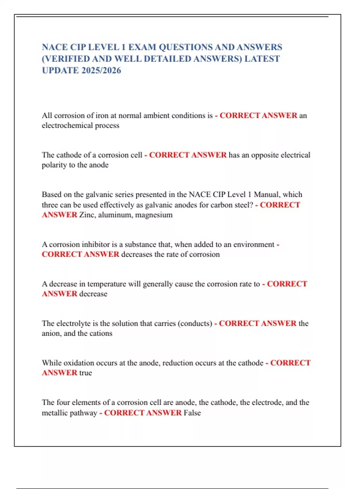 NACE CIP LEVEL 1 EXAM QUESTIONS AND ANSWERS (VERIFIED AND WELL DETAILED ANSWERS) LATEST UPDATE 2025/2026