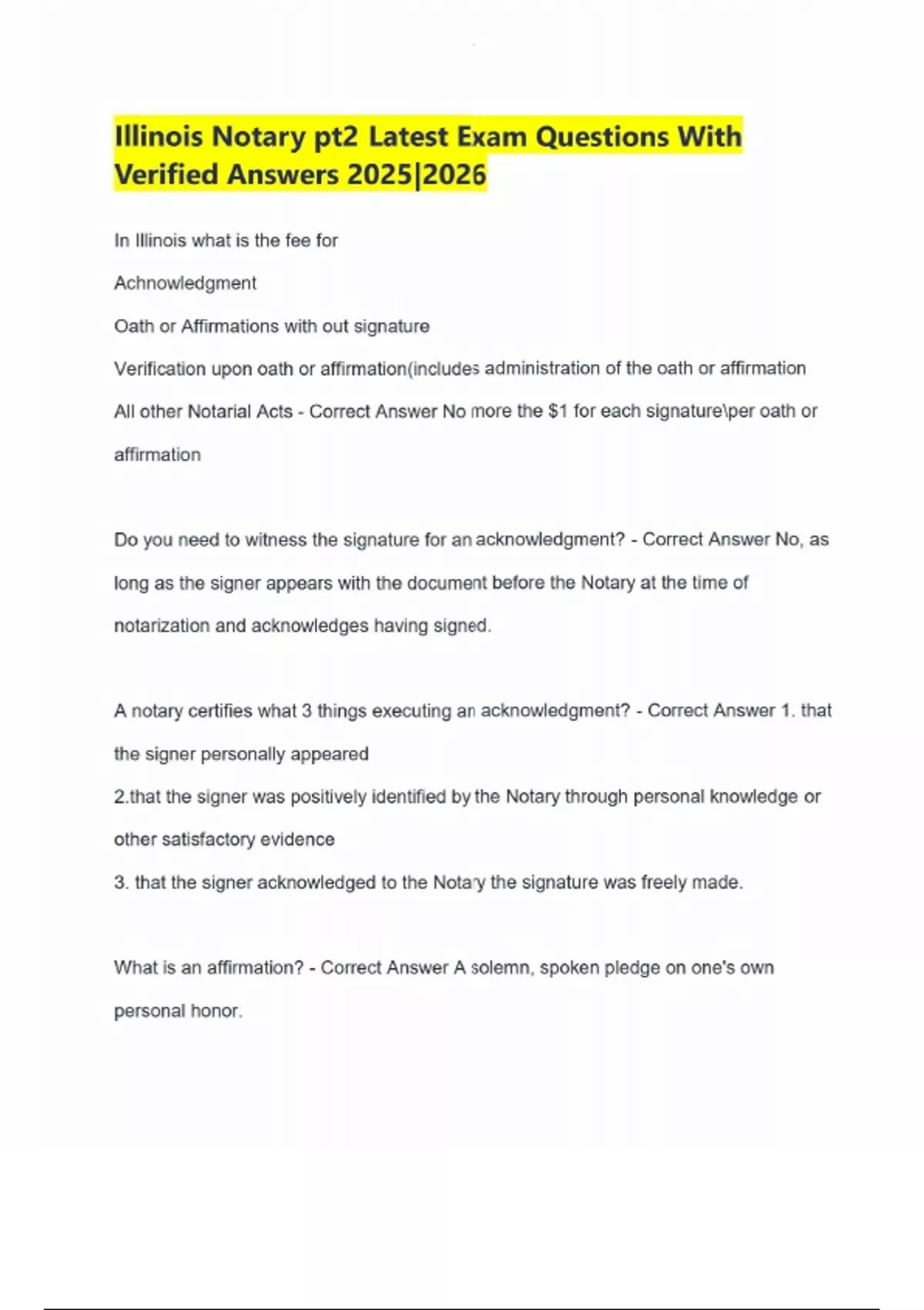 Illinois Notary Latest Exam Questions With Verified Answers 2024 In Illinois what is the fee for Achnowledgment Oath or Affirmations with out signature Verification upon oath or affirmation(includes administration of the oath or affirmation All other Notarial Acts - Correct Answer No more the $1 for each signatureper oath or affirmation Do you need to witness the signature for an acknowledgment? - Correct Answer No, as long as the signer appears with the document before the Notary at the time of notarization and acknowledges having signed. A notary certifies what 3 things executing an acknowledgment? - Correct Answer 1. that the signer personally appeared the signer was positively identified by the Notary through personal knowledge or other satisfactory evidence 3. that the signer acknowledged to the Notary the signature was freely made. What is an affirmation? - Correct Answer A solemn, spoken pledge on one's own personal honor. 2 types of Certificates for acknowledgment in Illinois - Correct Answer 1. For individuals signing on their own behalf 2. Short - form for signers in various representative capacites What is an oath? - Correct Answer It is a solemn, spoken pledge to a supreme being Purpose of an achknowledgment - Correct Answer Primary purpose to positively identify the document signer Notaries may perform the following Notary Acts - Correct Answer 1. acknowledgments 2. oaths and affirmations 3. Verification upon oath or affirmation 4.Witnessing or attesting signatures 5. proofs of execution by subscribing witness 3 ways a person may sign in a representative capacity - Correct Answer 1. For and on behalf of a corporation, partnership, trust or other entity as and authorized officer, agent, partner, trustee or other representative 2. As a public officer, personal representative, , guardian or other representative in the specific capacity described in the document.