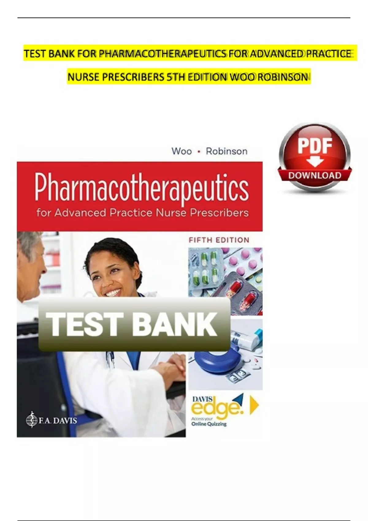 Looking for a fast and stress-free way to prep for that upcoming exam ,this Test Bank is all You Need .Includes questions, answers and rationale of correct answer. Great to study for exams and will increase your knowledge on the material. Pharmacotherapeutics for Advanced Practice Nurse Prescribers 5th Edition Woo & Robinson Test Bank UNIT I. THE FOUNDATION Chapter 1. The Role of the Nurse Practitioner as Prescriber Chapter 2. Review of the Basic Principles of Pharmacology Chapter 3. Rational Drug Selection Chapter 4. Legal and Professional Issues in Prescribing Chapter 5. Adverse Drug Reactions Chapter 6. An Introduction to Pharmacogenetics Chapter 7. Nutrition and Neutraceuticals Chapter 8. Herbal Therapies and Cannabis Chapter 9. Information Technology and Pharmacotherapeutics Chapter 10. Pharmacoeconomics UNIT II. PHARMACOTHERAPEUTICS WITH SINGLE DRUGS Chapter 11. Drugs Affecting the Autonomic Nervous System Chapter 12. Drugs Affecting the Central Nervous System Chapter 13. Drugs Affecting the Cardiovascular and Renal Systems Chapter 14. Drugs Affecting the Respiratory System Chapter 15. Drugs Affecting the Hematological System Chapter 16. Drugs Affecting the Immune System Chapter 17. Drugs Affecting the Gastrointestinal System Chapter 18. Drugs Affecting the Endocrine System: Pancreatic Hormones and Antidiabetic Drugs Chapter 19. Drugs Affecting the Endocrine System: Pituitary, Thyroid, and Adrenal Drugs Chapter 20. Drugs Affecting the Reproductive System Chapter 21. Drugs Affecting the Bones and Joints Chapter 22. Drugs Affecting the Integumentary System Chapter 23. Drugs Used to Treat Bacterial Infections Chapter 24. Drugs Used to Treat Viral, Fungal, and Protozoal Infections Chapter 25. Drugs Used to Treat Inflammatory Processes Chapter 26. Drugs Used to Treat Eye and Ear Disorders UNIT III. PHARMACOTHERAPEUTICS WITH MULTIPLE DRUGS Chapter 27. Alcohol and Drug Addiction Chapter 28. Anemia Chapter 29. Angina Chapter 30. Anxiety and Depression Chapter 31. Attention Deficit Hyperactivity Disorder Chapter 32. Asthma and Chronic Obstructive Pulmonary Disease Chapter 33. Contraception Chapter 34. Dermatological Conditions Chapter 35. Diabetes Management Chapter 36. Gastroesophageal Reflux and Peptic Ulcer Disease Chapter 37. Headaches Chapter 38. Heart Failure Chapter 39. Human Immunodeficiency Virus Disease and Acquired Immunodeficiency Syndrome Chapter 40. Hormone Replacement Therapy Chapter 41. Hyperlipidemia Chapter 42. Hypertension Chapter 43. Hyperthyroidism and Hypothyroidism Chapter 44. Pain Management: Acute and Chronic Pain Chapter 45. Pneumonia Chapter 46. Tobacco Cessation Chapter 47. Sexually Transmitted Diseases and Vaginitis Chapter 48. Tuberculosis Chapter 49. Upper Respiratory Infection, Pharyngitis, Sinusitis, Otitis Media, and Otitis Externa Chapter 50. Urinary Tract Infection UNIT IV. SPECIAL DRUG TREATMENT CONSIDERATIONS Chapter 51. Women as Patients Chapter 52. Men as Patients Chapter 53. Pediatric Patients Chapter 54. Transgendered Clients as Patients Chapter 55. Geriatric Patients Unit I. The Foundation Chapter 1. The Role of the Nurse Practitioner as Prescriber Multiple Choice Identify the choice that best completes the statement or answers the question. 1. Nurse practitioner prescriptive authority is regulated by: 1. The National Council of State Boards of Nursing 2. The U.S. Drug Enforcement Administration 3. The State Board of Nursing for each state 4. The State Board of Pharmacy 2. The benefits to the patient of having an Advanced Practice Registered Nurse (APRN) prescriber include: 1. Nurses know more about Pharmacology than other prescribers because they take it both in their basic nursing program and in their APRN program. 2. Nurses care for the patient from a holistic approach and include the patient in decision making regarding their care. 3. APRNs are less likely to prescribe narcotics and other controlled substances. 4. APRNs are able to prescribe independently in all states, whereas a physician’s assistant needs to have a physician supervising their practice. 3. Clinical judgment in prescribing includes: 1. Factoring in the cost to the patient of the medication prescribed 2. Always prescribing the newest medication available for the disease process 3. Handing out drug samples to poor patients 4. Prescribing all generic medications to cut costs 4. Criteria for choosing an effective drug for a disorder include: 1. Asking the patient what drug they think would work best for them 2. Consulting nationally recognized guidelines for disease management 3. Prescribing medications that are available as samples before writing a prescription 4. Following U.S. Drug Enforcement Administration guidelines for prescribing 5. Nurse practitioner practice may thrive under health-care reform because of: 1. The demonstrated ability of nurse practitioners to control costs and improve patient outcomes 2. The fact that nurse practitioners will be able to practice independently 3. The fact that nurse practitioners will have full reimbursement under health-care reform 4. The ability to shift accountability for Medicaid to the state level Chapter 1. The Role of the Nurse Practitioner Answer Section MULTIPLE CHOICE 1. ANS: 3 PTS: 1 2. ANS: 2 PTS: 1 3. ANS: 1 PTS: 1 4. ANS: 2 PTS: 1 5. ANS: 1 PTS: 1 Chapter 2. Review of Basic Principles of Pharmacology Multiple Choice Identify the choice that best completes the statement or answers the question. 1. A patient’s nutritional intake and laboratory results reflect hypoalbuminemia. This is critical to prescribing because: 1. Distribution of drugs to target tissue may be affected. 2. The solubility of the drug will not match the site of absorption. 3. There will be less free drug available to generate an effect. 4. Drugs bound to albumin are readily excreted by the kidneys. 2. Drugs that have a significant first-pass effect: 1. Must be given by the enteral (oral) route only 2. Bypass the hepatic circulation 3. Are rapidly metaboliz