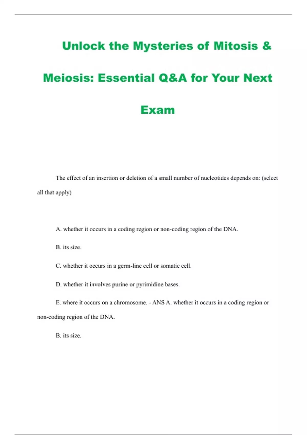 Unlock the Mysteries of Mitosis & Meiosis: Essential Q&A for Your Next Exam The effect of an insertion or deletion of a small number of nucleotides depends on: (select all that apply) A. whether it occurs in a coding region or non-coding region of the DNA. B. its size. C. whether it occurs in a germ-line cell or somatic cell. D. whether it involves purine or pyrimidine bases. E. where it occurs on a chromosome. - ANS A. whether it occurs in a coding region or non-coding region of the DNA. B. its size. The genome of a newly identified organism is discovered and genome assembly shows that it is a single continuous strand of DNA. Which is more likely? A. The organism is a bacterium. B. The organism is a eukaryote. C. Either option is equally possible. - ANS A. The organism is a bacterium. Dosage refers to the number of copies of each gene in a chromosome. A. true B. false - ANS A. true The use of antibiotics is creating the mutations in bacteria that make them resistant to these antibiotics. A. true B. false - ANS B. false The fact that humans have a relatively large number of mutations per genome per generation when compared to other organisms can be explained by: A. human cells don't divide as often as those of other organisms. B. humans are so complex we have multiple proteins doing the same job. C. most of a human's DNA is noncoding, so most of the mutations are neutral. D. humans have multiple proteins doing the same job, and our cells don't divide as often as other those of other organisms. E. most of these mutations happen after reproduction, so they wouldn't be selected against. - ANS C. most of a human's DNA is noncoding, so most of the mutations are neutral. Which of the following would best describe the results seen in a flower whose sectors have different pigmentation? A. the result of a deletion B. the result of transposable elements C. the result of the plant being triploid D. the result of the plant being tetraploid E. the result of a germ-line mutation - ANS B. the result of transposable elements A trinucleotide of 5'CTC3' or 5'TTC3' is transcribed and then translated into the amino acid glutamic acid. A trinucleotide of 5'CAA3' or 5'TAC3' is transcribed and then translated into valine. In sickle-cell hemoglobin, valine is present instead of glutamic acid. Assuming a single base pair substitution has occurred, what is the mRNA code for valine in the affected mutant? A. CUU B. GAA C. GAG D. GUA E. UUG - ANS D. GUA Mutation rates (of nucleotides): A. are higher in organisms with larger genomes. B. are similar across all organisms. C. are highest in viruses. D. are lower in organisms with larger genomes. E. are highest in the bacteria. - ANS C. are highest in viruses. At the start of mitosis, how many centromeres are present in a human cell? A. 46 B. 12 C. 23 D. 92 - ANS A. 46 Which of the following statements is true regarding binary fission? A. Proteins only anchor the originalcircular genome to the plasma membrane; the copy produced by DNA replication is free-floating. B. In binary fission, cell division is typically asymmetrical, with one daughter cell appearing much smaller than the other. C. Tubulin, rather than FtsZ, is responsible for cell division during binary fission. D. DNA replication during binary fission is a bidirectionalprocess, occurring in opposite directions. E. None of the above answers are correct. - ANS D. DNA replication during binary fission is a bidirectionalprocess, occurring in opposite directions. Why don't plant cells use a contractile ring to divide their daughter cells? A. Plant cells don't have an actin cytoskeleton. B. Plant cells don't form daughter cells. C. A contractile ring can't "pinch" a cell wall. D. Plant cells don't have plasma membranes. - ANS C. A contractile ring can't "pinch" a cell wall. Predict what would happen if crossing over occurred as part of mitosis. A. Daughter cells could contain two copies of the same allele. B. Daughter cells would not be genetically identical. C. There would be no effect since sister chromatids separate in anaphase. D. Daughter cells would not be genetically identical, and they could contain two copies of the same allele. - ANS D. Daughter cells would not be genetically identical, and they could contain two copies of the same allele. Sexual reproduction: A. results in a new generation with the same number of chromosomes as the parents. B. results in a new generation that is not genetically identical to its parents. C. results in offspring that are not genetically identical. D. results from combining genetic material from two gametes. E. All of these choices are correct. - ANS E. All of these choices are correct.