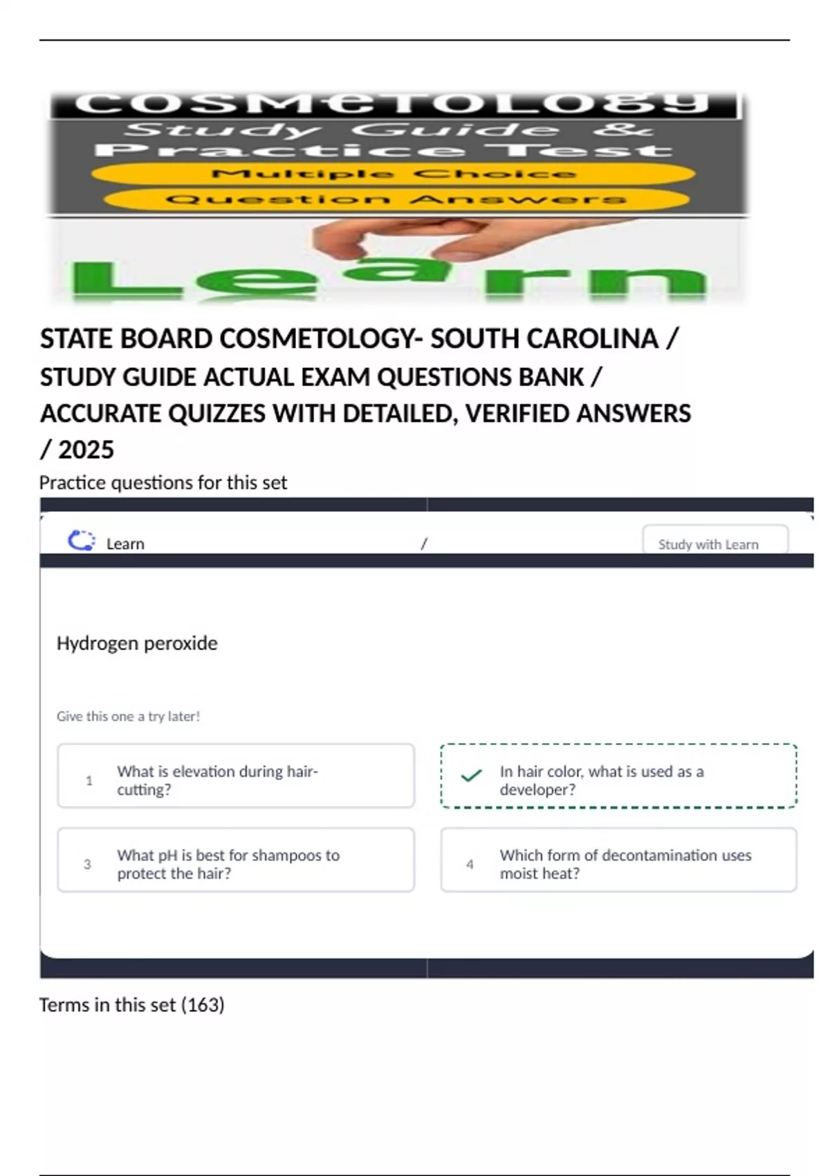 STATE BOARD COSMETOLOGY- SOUTH CAROLINA / STUDY GUIDE ACTUAL EXAM QUESTIONS BANK / ACCURATE QUIZZES WITH DETAILED, VERIFIED ANSWERS / 2025