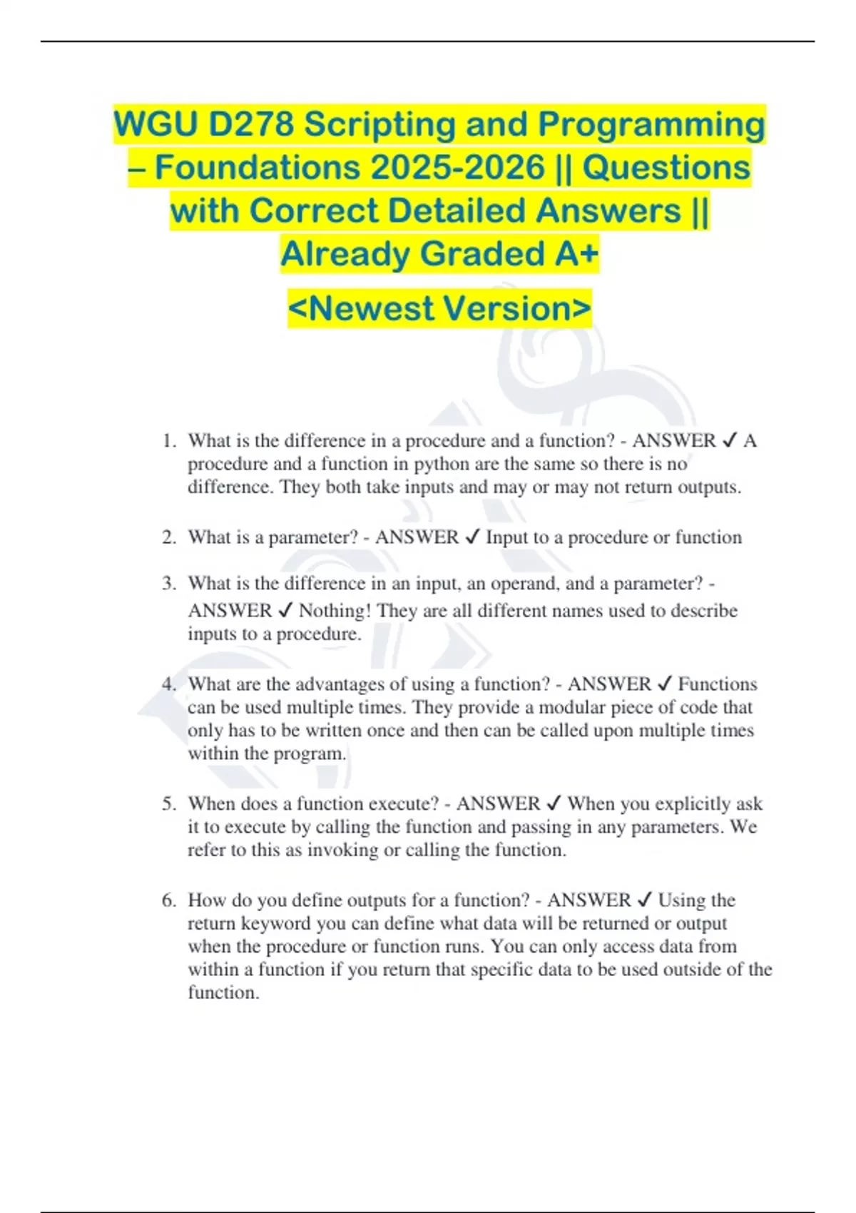 WGU D278 Scripting and Programming – Foundations Exam || Questions with Correct Detailed Answers || Already Graded A+ &lt;Newest Version&gt; 1. What is the difference in a procedure and a function? - ANSWER A procedure and a function in python are the same so there is no difference. They both take inputs and may or may not return outputs. 2. What is a parameter? - ANSWER Input to a procedure or function 3. What is the difference in an input, an operand, and a parameter? - ANSWER Nothing! They are all different names used to describe inputs to a procedure. 4. What are the advantages of using a function? - ANSWER Functions can be used multiple times. They provide a modular piece of code that only has to be written once and then can be called upon multiple times within the program. 5. When does a function execute? - ANSWER When you explicitly ask it to execute by calling the function and passing in any parameters. We refer to this as invoking or calling the function. 6. How do you define outputs for a function? - ANSWER Using the return keyword you can define what data will be returned or output when the procedure or function runs. You can only access data from within a function if you return that specific data to be used outside of the function. 7. How is a while loop constructed in Python? What is its purpose? - ANSWER executes any number of times, continuing as long as the test expression is True while &lt;TestExpression&gt;: &lt;Block&gt; 8. How is an if else statement constructed in Python? What is its purpose? - ANSWER provides a way to control what code executes based on the result of a test expression if &lt;TestExpression&gt;: &lt;block&gt; else: &lt;block&gt; 9. How are compound mathematical expressions evaluated in Python? - ANSWER First perform calculations within parentheses. Next work left to right and perform all multiplication and division. Finally, work left to right and perform all addition and subtraction 10. What is the function of parentheses, (), in programming expressions? - ANSWER When we are working with an expression, they group items within that expressions. Items within parentheses are evaluated first. For example: (5 + 3) * 8 = 64 because we do the addition first, then multiplication 5 + 3 * 8 = 29 because we do the multiplication first, then the addition. 11. Which language is dynamically typed? - ANSWER Python 12. Which language is not built on object-oriented design principles? - ANSWER C 13. A language substantially supports a programmer creating items like person, teacher, and students. Each item has internal data and some operations. Which characteristic describes that language? - ANSWER Object-oriented 14. A programmer wants a compiler to report an error if an integer variable is assigned with a string. Which kind of language should the programmer use? - ANSWER Statically typed 15. A language uses tags around text to indicate how that text should be formatted. Which characteristic describes a language having such tags? - ANSWER Markup 16. What is a characteristic of a compiled language? - ANSWER Converts to machine language before running 17. What is a characteristic of an interpreted language? - ANSWER Runs easily on different kinds of machines 18. What is an advantage of interpreted programs? - ANSWER They can be modified at run time. 19. Which characteristic specifically describes a markup language? - ANSWER Tags surround text to describe desired formatting. 20. Which characteristic specifically describes interpreted languages? - ANSWER They can be run one statement at a time. 21. Moore's Law - ANSWER The trend of engineers reducing switch sizes by half approximately every 2 years. 22. embedded computer - ANSWER computer inside another electrical device. 23. Three basic instruction types - ANSWER Input, process, output 24. computer program - ANSWER set of instructions that a computer follows to perform tasks. These tasks can be anything from playing a video on your phone to helping a plane fly. 25. computer program instruction types - ANSWER Input: The program gets data from somewhere. Ex: Typing on a keyboard, touching a screen, reading a file, or receiving data from the internet. Process: The program does something with the data. Ex: Adding two numbers together, sorting a list of names, or calculating the average of some scores. Output: The program sends data somewhere. Ex: Displaying text on a screen, saving a file, or sending a message over the internet. 26. Variables - ANSWER Variables are like containers that hold data. Why they're called variables: The value inside a variable can change, or "vary," as the program runs. Ex: x = 5 (Here, x is a variable holding the value 5) y = x + 3 (Now, y is a variable holding the value 8 because x was 5) 27. Algorithm - ANSWER An algorithm is a sequence of instructions that solves a problem. Ex: Think of an algorithm as a step-by-step guide. For instance, a recipe for baking a cake is an algorithm. It tells you what ingredients to use and the steps to follow to bake the cake. 28. Flowchart - ANSWER a visual representation of the steps in a process or program. It uses different shapes to represent different types of actions or steps. Flowchart Symbols Oval: Represents the start and end of the program. Parallelogram: Represents input and output operations. Rectangle: Represents processing steps (like calculations). Arrow: Shows the direction of the flow of steps. 29. Interpreter - ANSWER type of program that runs other programs by reading and executing each statement one at a time.