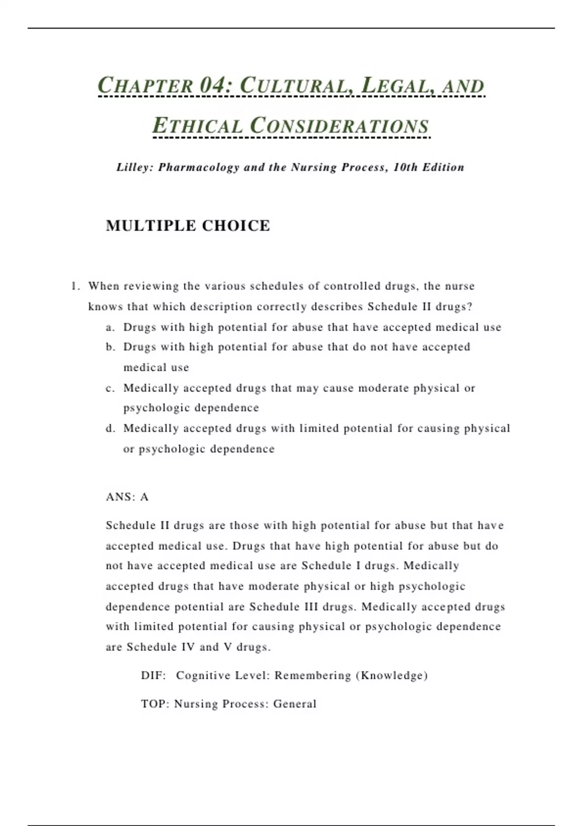 Lilley: Pharmacology and the Nursing Process, 10th Edition MULTIPLE CHOICE 1. When reviewing the various schedules of controlled drugs, the nurse knows that which description correctly describes Schedule II drugs? a. Drugs with high potential for abuse that have accepted medical use b. Drugs with high potential for abuse that do not have accepted medical use c. Medically accepted drugs that may cause moderate physical or psychologic dependence d. Medically accepted drugs with limited potential for causing physical or psychologic dependence ANS: A Schedule II drugs are those with high potential for abuse but that have accepted medical use. Drugs that have high potential for abuse but do not have accepted medical use are Schedule I drugs. Medically accepted drugs that have moderate physical or high psychologic dependence potential are Schedule III drugs. Medically accepted drugs with limited potential for causing physical or psychologic dependence are Schedule IV and V drugs. DIF: Cognitive Level: Remembering (Knowledge) TOP: Nursing Process: General MSC: NCLEX: Physiological Integrity: Pharmacological and Parenteral Therapies 2. The nurse is reviewing facts about pharmacology for a review course. The term legend drug refers to which item? a. Over-the-counter drugs b. Prescription drugs c. Orphan drugs d. Older drugs ANS: B The term legend drug refers to prescription drugs, which were differentiated from over-the-counter drugs by the 1951 Durham-Humphrey Amendment. Orphan drugs are drugs that are developed for rare diseases. The other options are not examples of legend drugs. DIF: Cognitive Level: Understanding (Comprehension) TOP: Nursing Process: General MSC: NCLEX: Physiological Integrity: Pharmacological and Parenteral Therapies 3. Nurses have the ethical responsibility of doing or actively promoting good. What is this principle known as? a. Justice b. Veracity c. Beneficence d. Autonomy