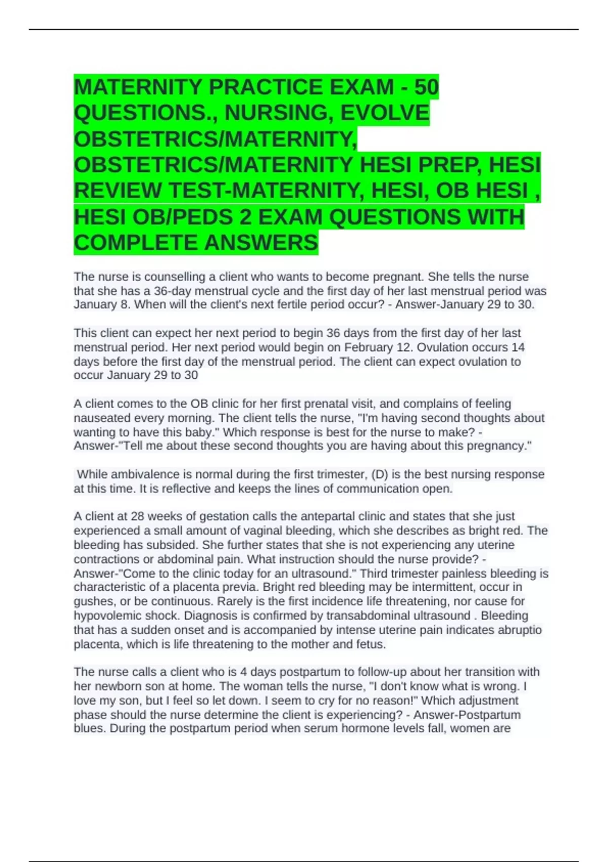 MATERNITY PRACTICE EXAM - 50 QUESTIONS., NURSING, EVOLVE OBSTETRICS/MATERNITY, OBSTETRICS/MATERNITY HESI PREP, HESI REVIEW TEST-MATERNITY, HESI, OB HESI , HESI OB/PEDS 2 EXAM QUESTIONS WITH COMPLETE ANSWERS
