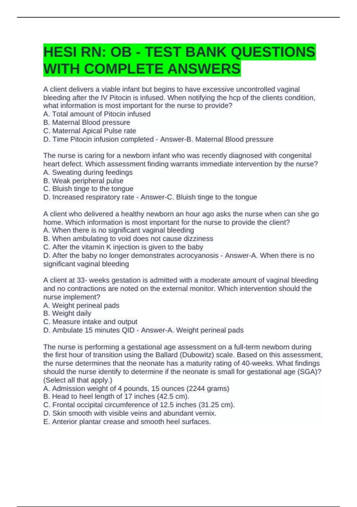HESI RN: OB - TEST BANK QUESTIONS WITH COMPLETE ANSWERS