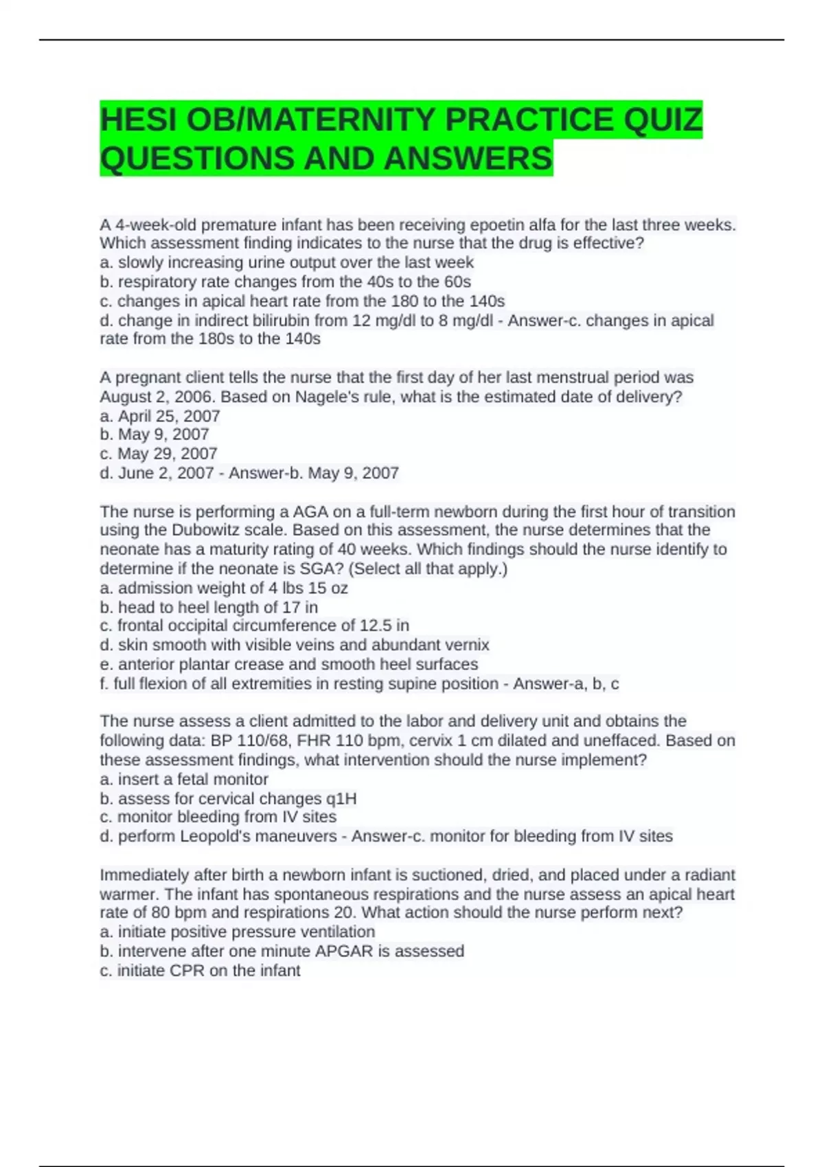 HESI OB/MATERNITY PRACTICE QUIZ QUESTIONS AND ANSWERS