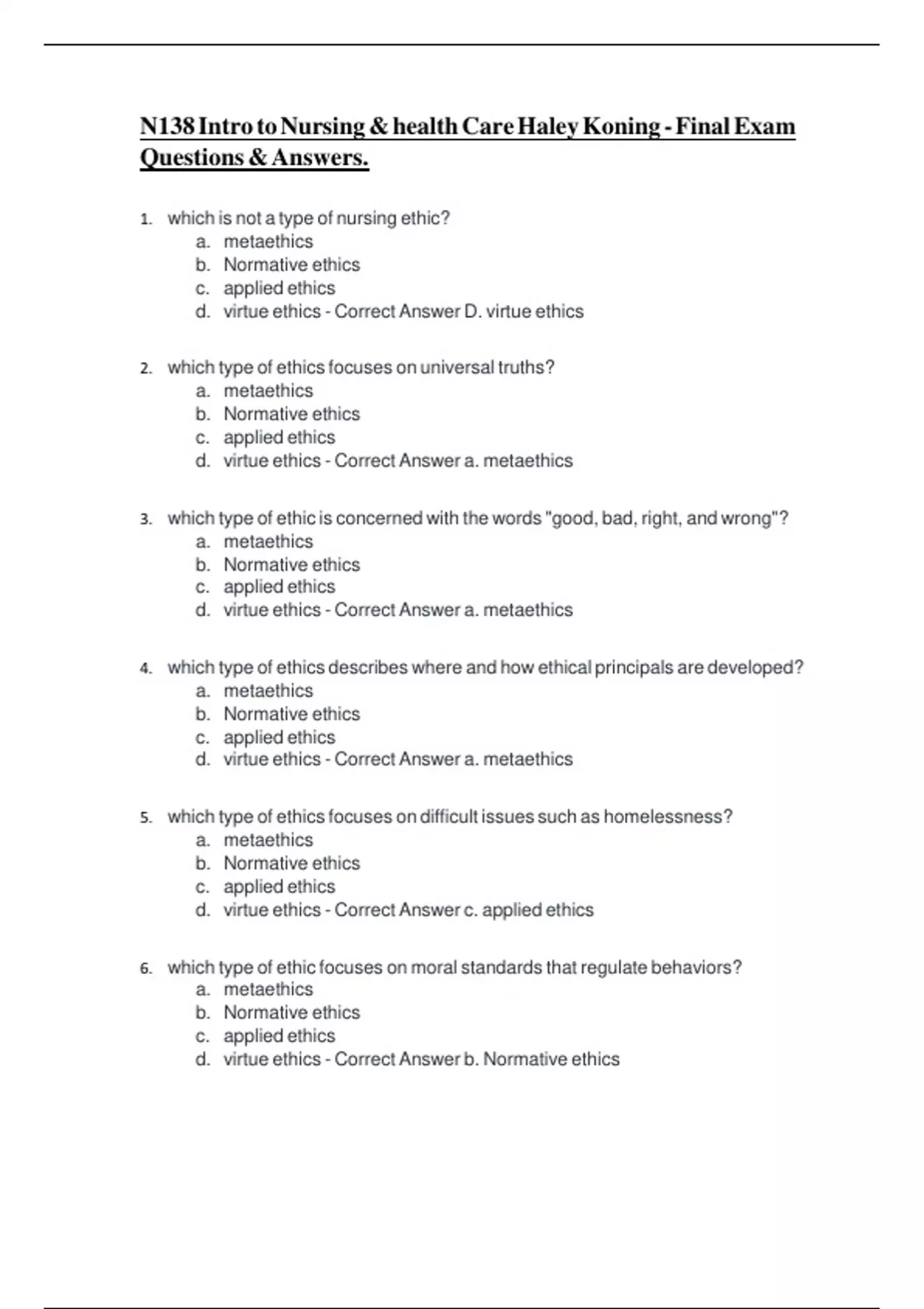 d. virtue ethics - Correct Answer a. metaethics