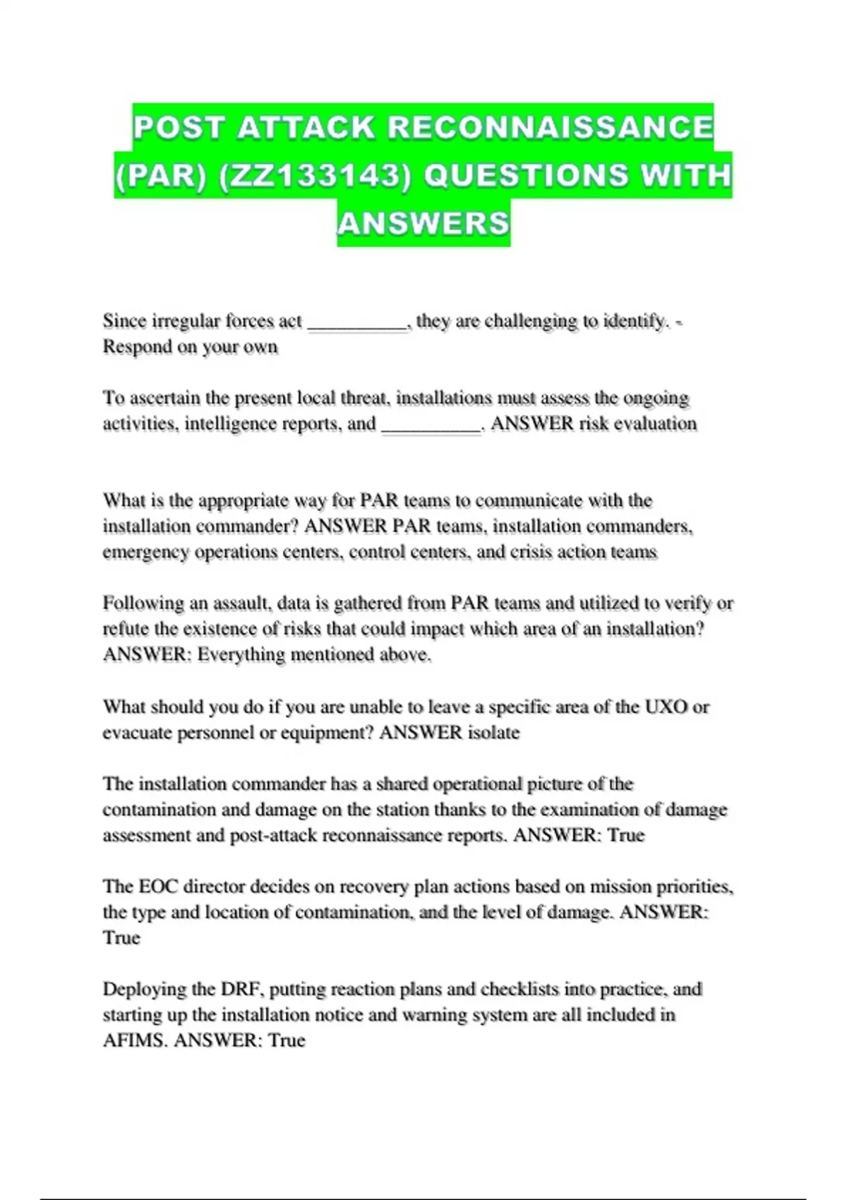 POST ATTACK RECONNAISSANCE (PAR) (ZZ133143) QUESTIONS WITH ANSWERS...