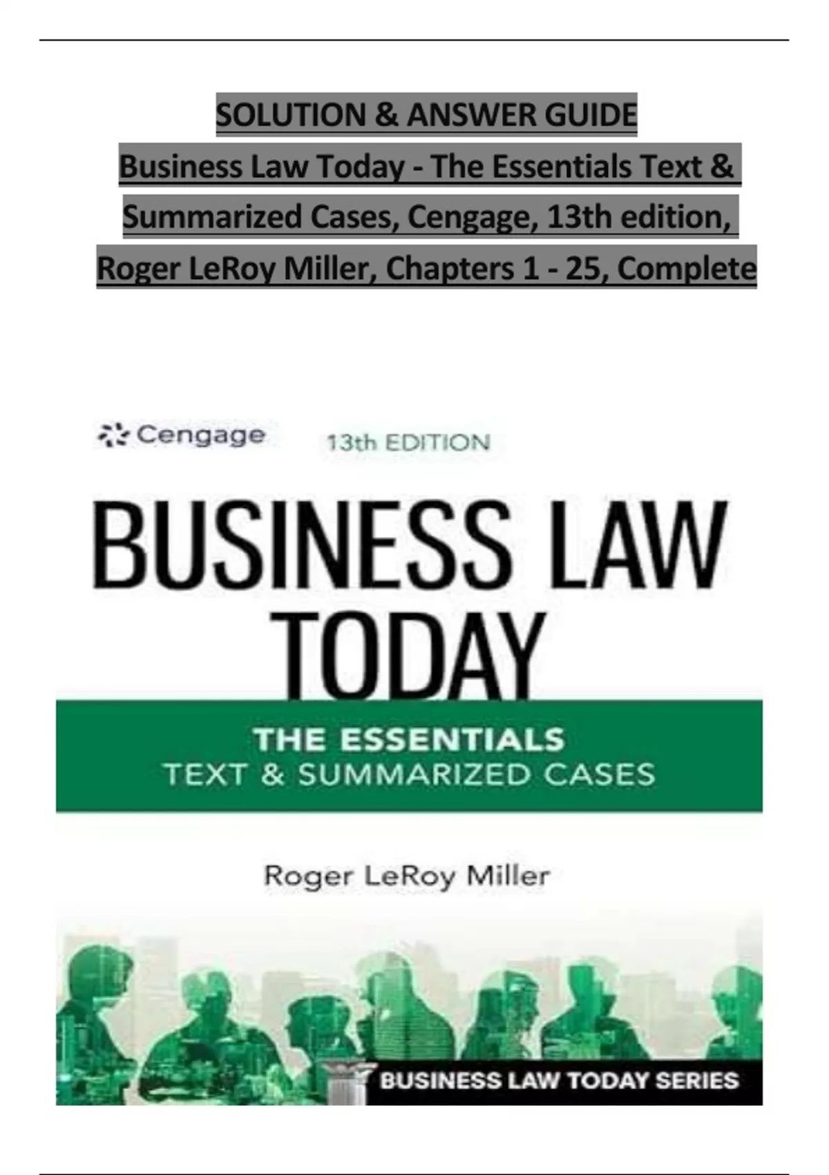 SOLUTION and ANSWER GUIDE for Business Law Today - The Essentials Text & Summarized Cases, Cengage, 13th edition, by Roger LeRoy Miller, all Chapters 1- 25 complete