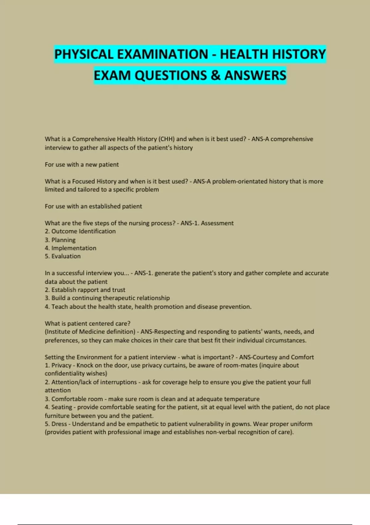 PHYSICAL EXAMINATION - HEALTH HISTORY EXAM QUESTIONS & ANSWERS