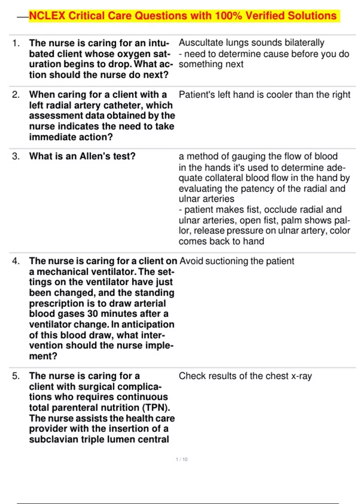 , NCLEX Critical Care Questions with 100% Verified Solutions