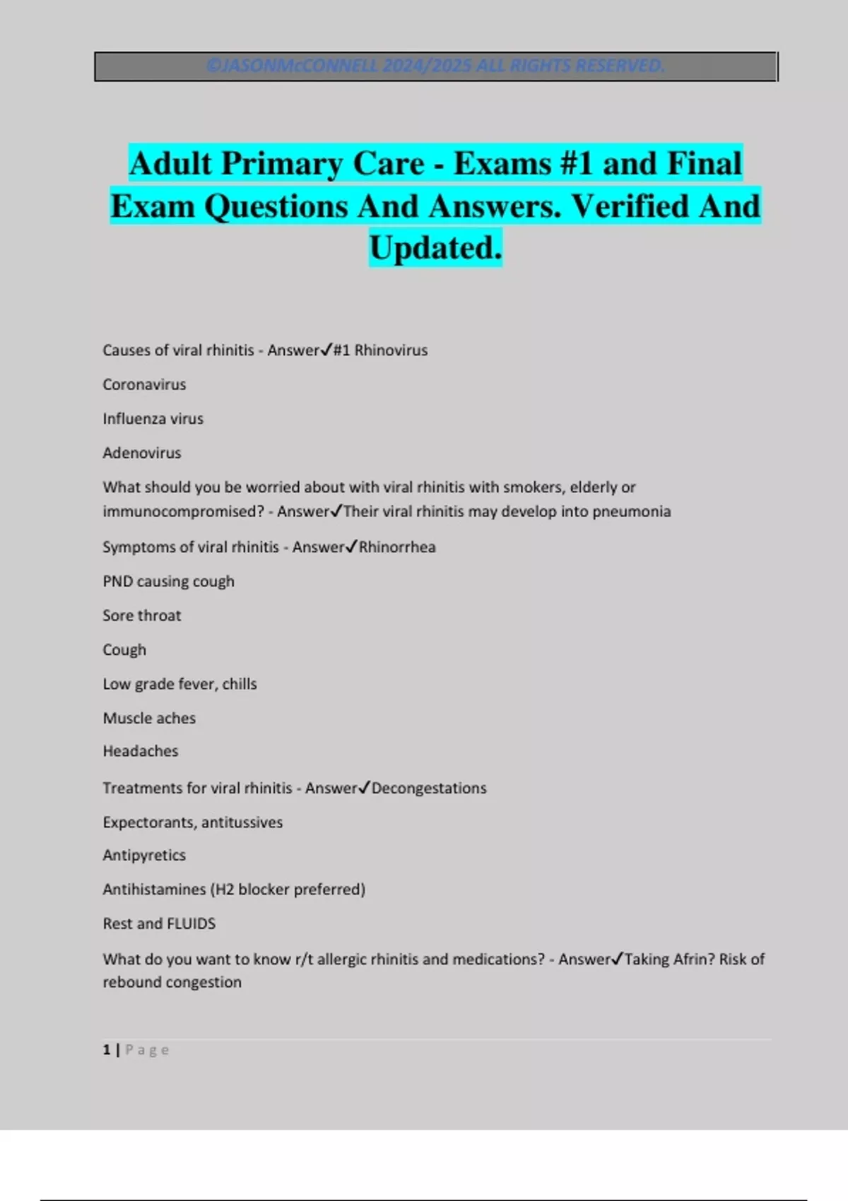 Adult Primary Care - Exams #1 and Final Exam Questions And Answers. Verified And Updated. Causes of viral rhinitis - Answer#1 Rhinovirus Coronavirus Influenza virus Adenovirus What should you be worried about with viral rhinitis with smokers, elderly or immunocompromised? - AnswerTheir viral rhinitis may develop into pneumonia Symptoms of viral rhinitis - AnswerRhinorrhea PND causing cough Sore throat Cough Low grade fever, chills Muscle aches Headaches Treatments for viral rhinitis - AnswerDecongestations Expectorants, antitussives Antipyretics Antihistamines (H2 blocker preferred) Rest and FLUIDS What do you want to know r/t allergic rhinitis and medications? - AnswerTaking Afrin? Risk of rebound congestion ©JASONMcCONNELL 2024/2025 ALL RIGHTS RESERVED. 2 | P a g e What should you suspect with someone who has allergic rhinitis and a fever and/or purulent drainage? - AnswerThat they have a secondary bacterial infection --> often progresses to sinusitis What can longstanding allergies cause? - AnswerAdenoidal hypertrophy which can increase asthma risk What do you think when a person has blue, boggy, edematous turbinates? - AnswerAllergic rhinitis What are Dennie's lines? - AnswerAn infraorbital fold indicative of allergic rhinitis What can alleviate allergic shiners? - Answer2nd generation antihistamines; topical nasal steroids Treatment for allergic rhinitis? - Answer**Allergen avoidance Antihistamines Decongestants Topical nasal steroids (e.g. Rhinocort/Nasocort) Hydration With what condition is IgE elevated? With what condition is it normal? - AnswerElevated = allergic rhinitis Normal = vasomotor rhinitis What would you expect when someone complains of nasal congestion/discharge that came on suddenly after exposure to stimuli and they have pale or hyperemic turbinates? - AnswerVasomotor rhinitis What might you suspect after someone has had viral rhinitis for over a week (7-10 days)? - AnswerSinusitis Most common pathogens causing sinusitis - AnswerStrep pneumoniae H. flu M. catarrhalis What would make you suspect acute sinusitis over a URI? - Answer1) Symptoms that last over 10 days 2) Onset with severe sympto