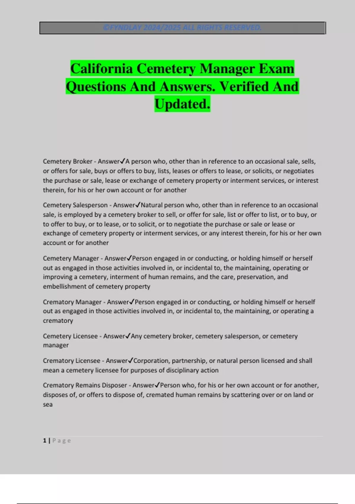 Cemetery Licensee - Answer✔Any cemetery broker, cemetery salesperson, or cemetery